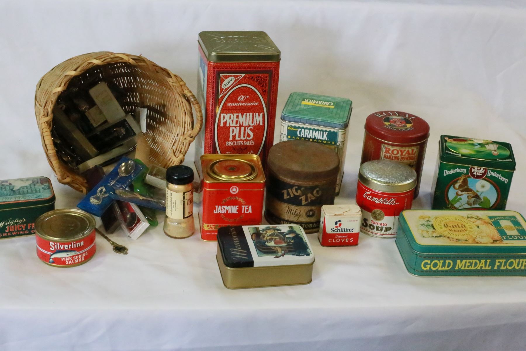 BASKET OF COLLECTOR SPOONS AND COLLECTIBLE TINS