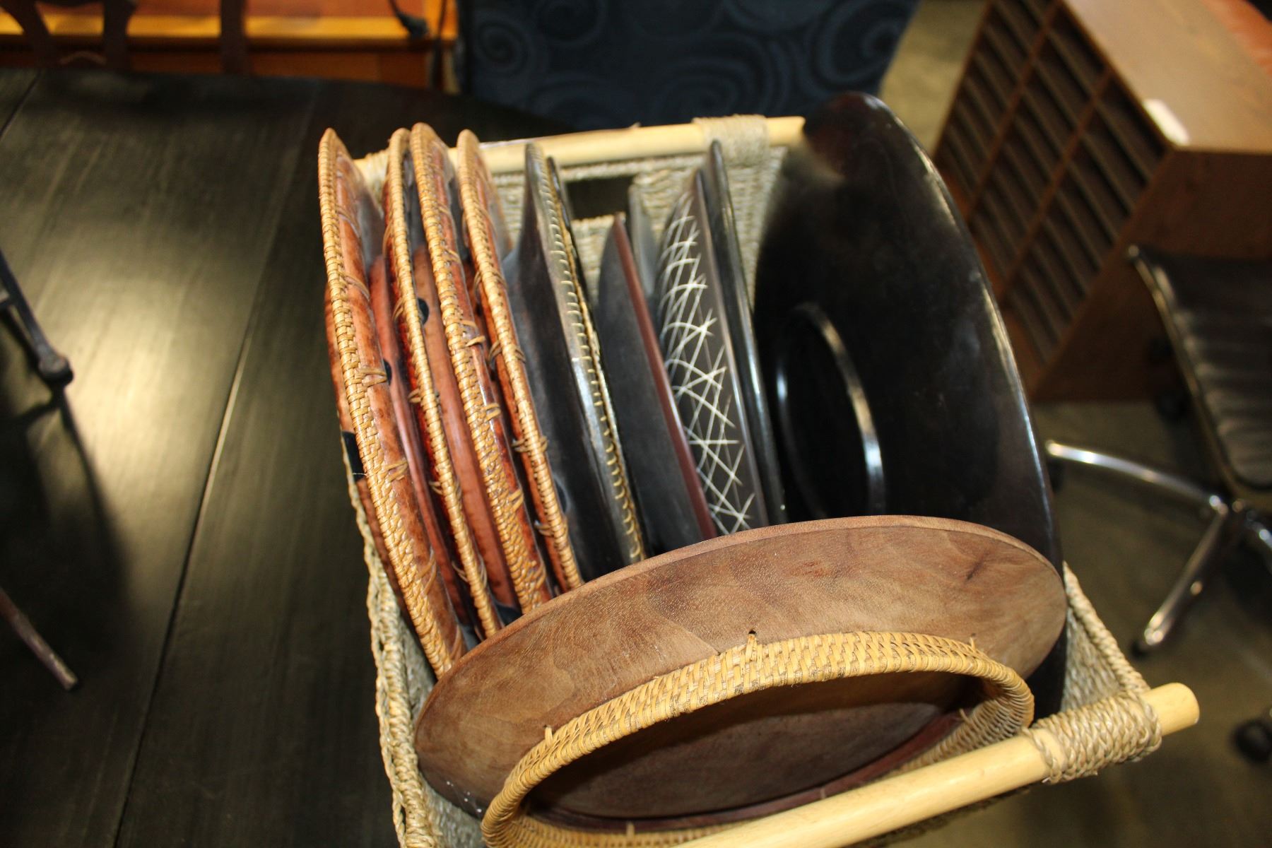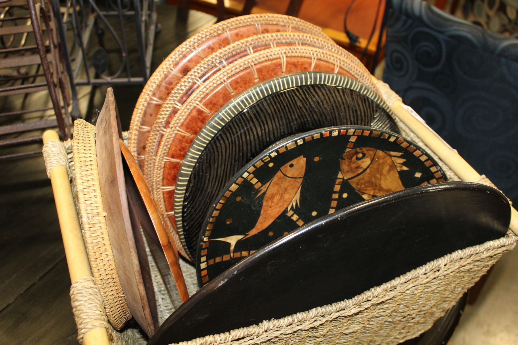 BASKET OF DECORATIVE SERVING PLATTERS ETC