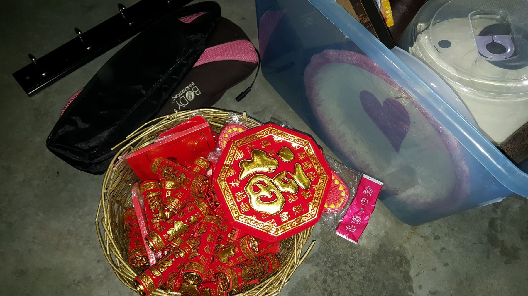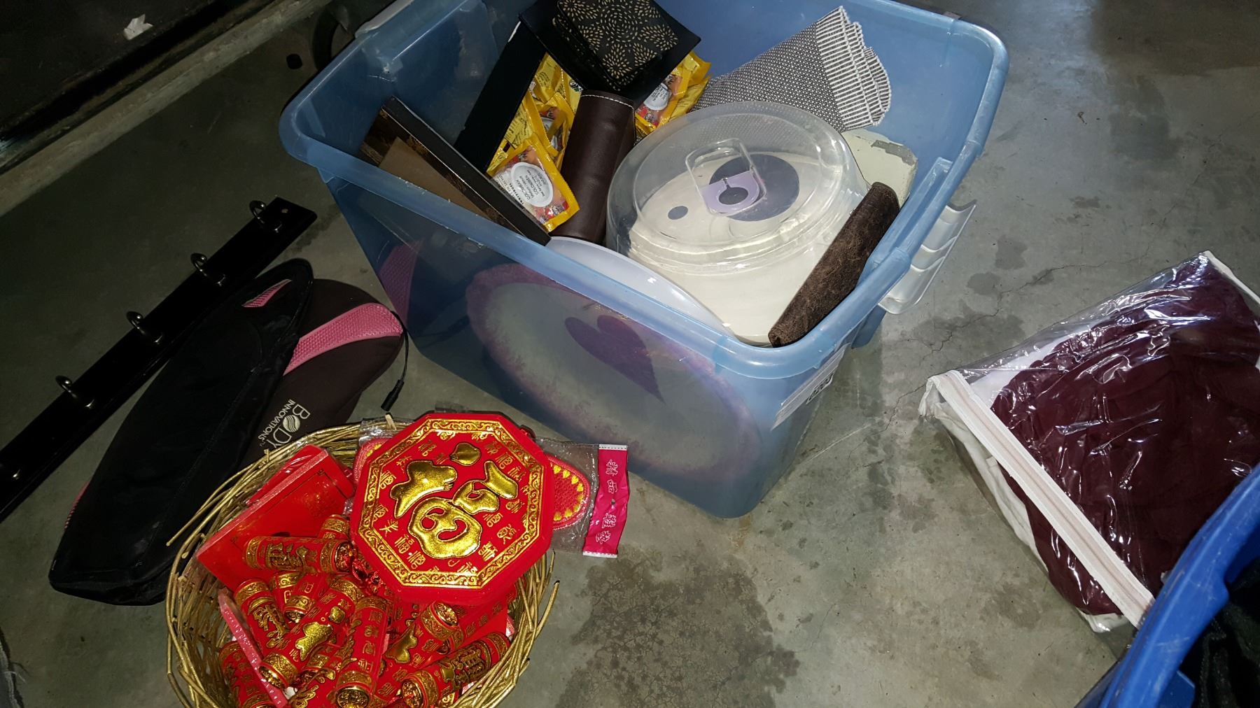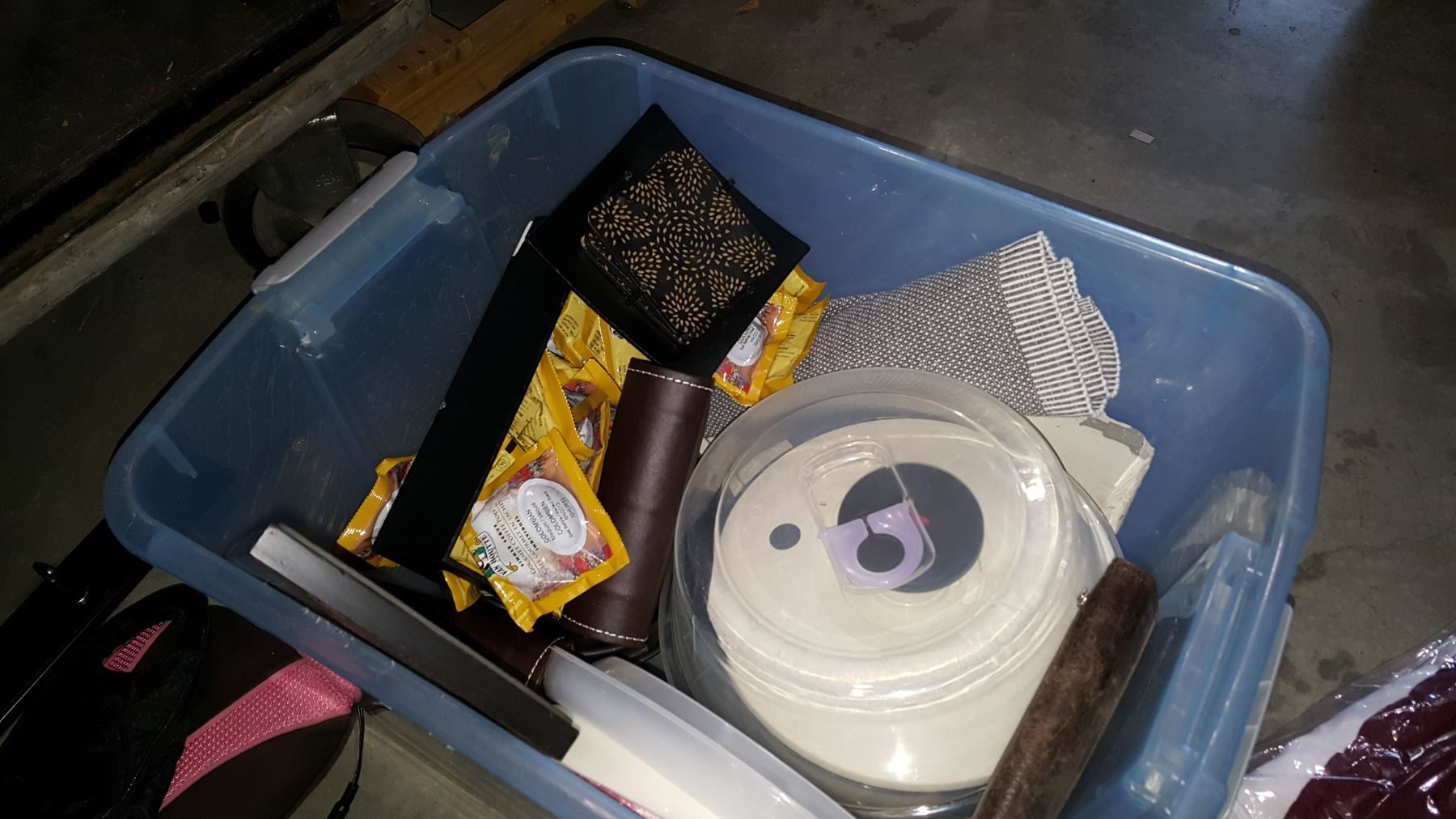 BASKET OF EASTERN DECORATIONS AND TOTE OF ESTATE GOODS COFFEE AND LINENS