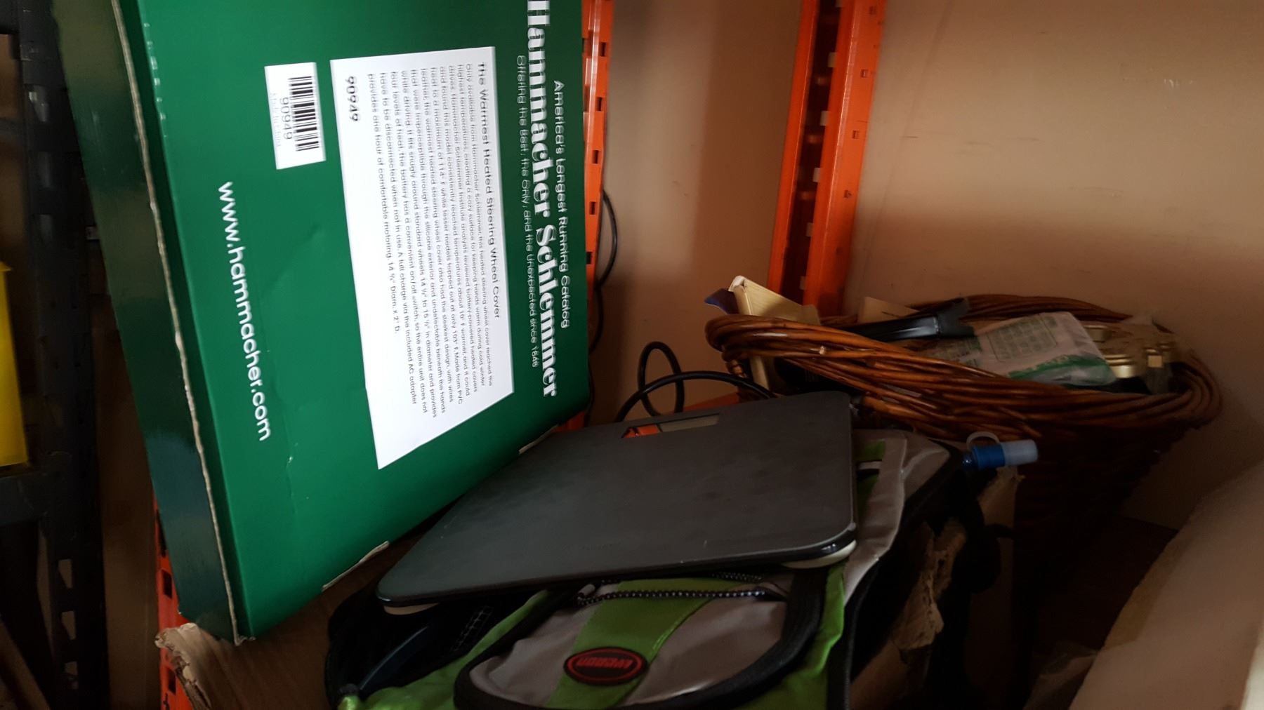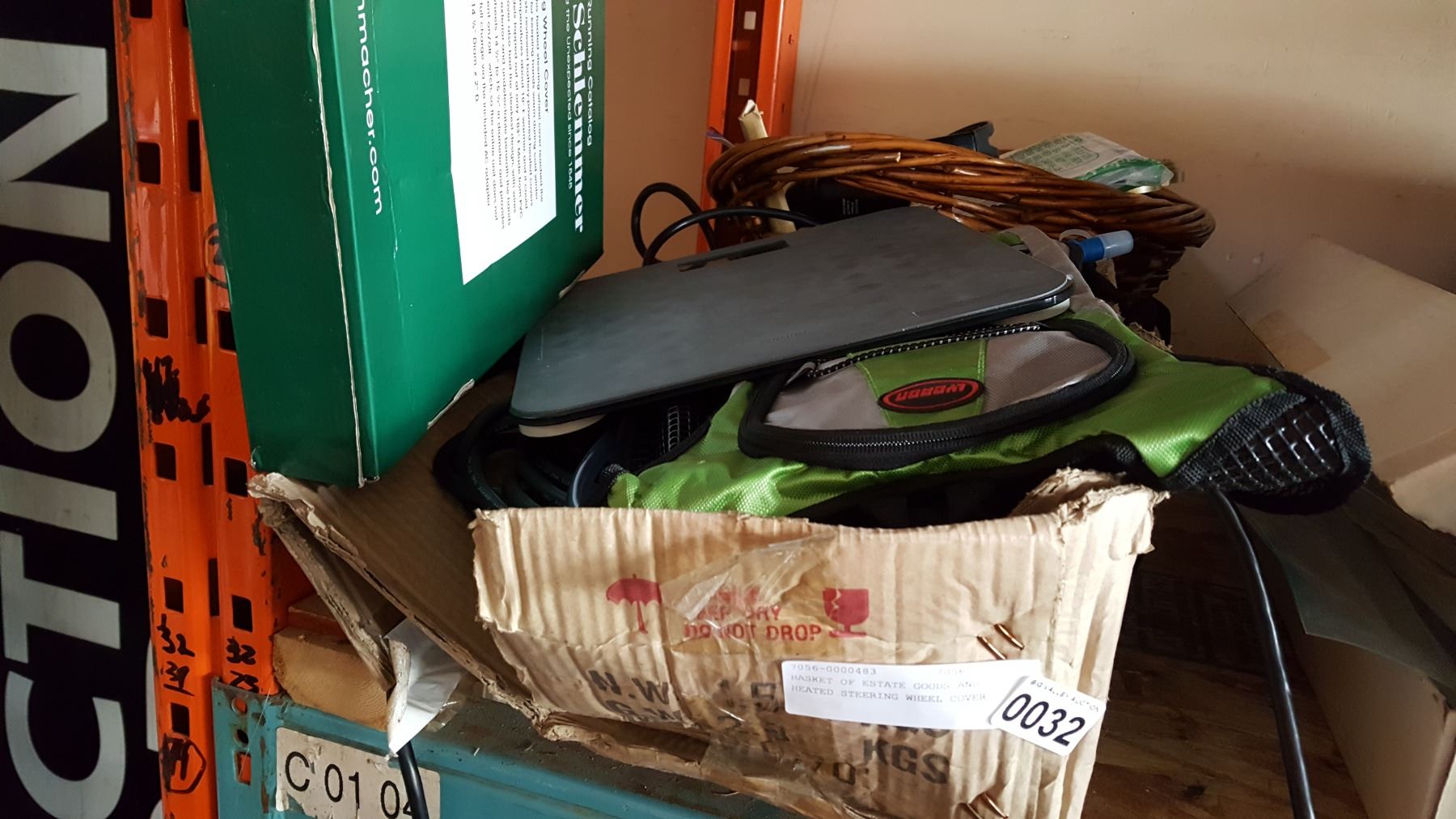 BASKET OF ESTATE GOODS AND HEATED STEERING WHEEL COVER