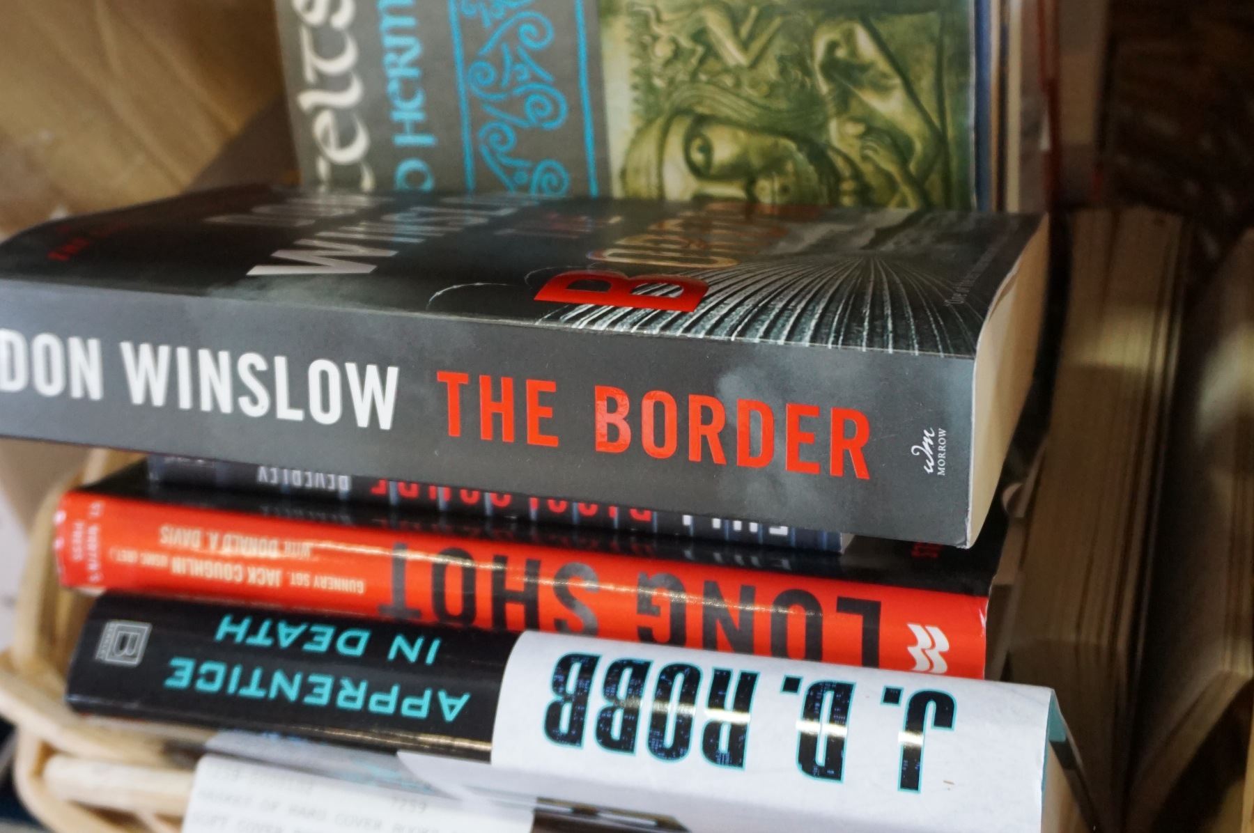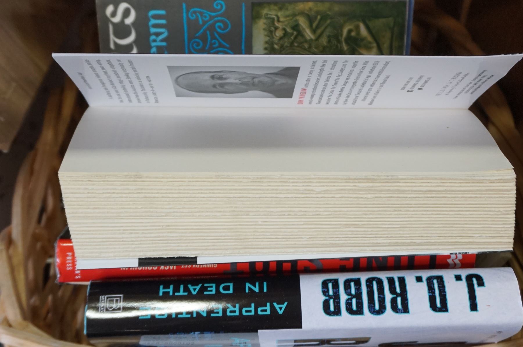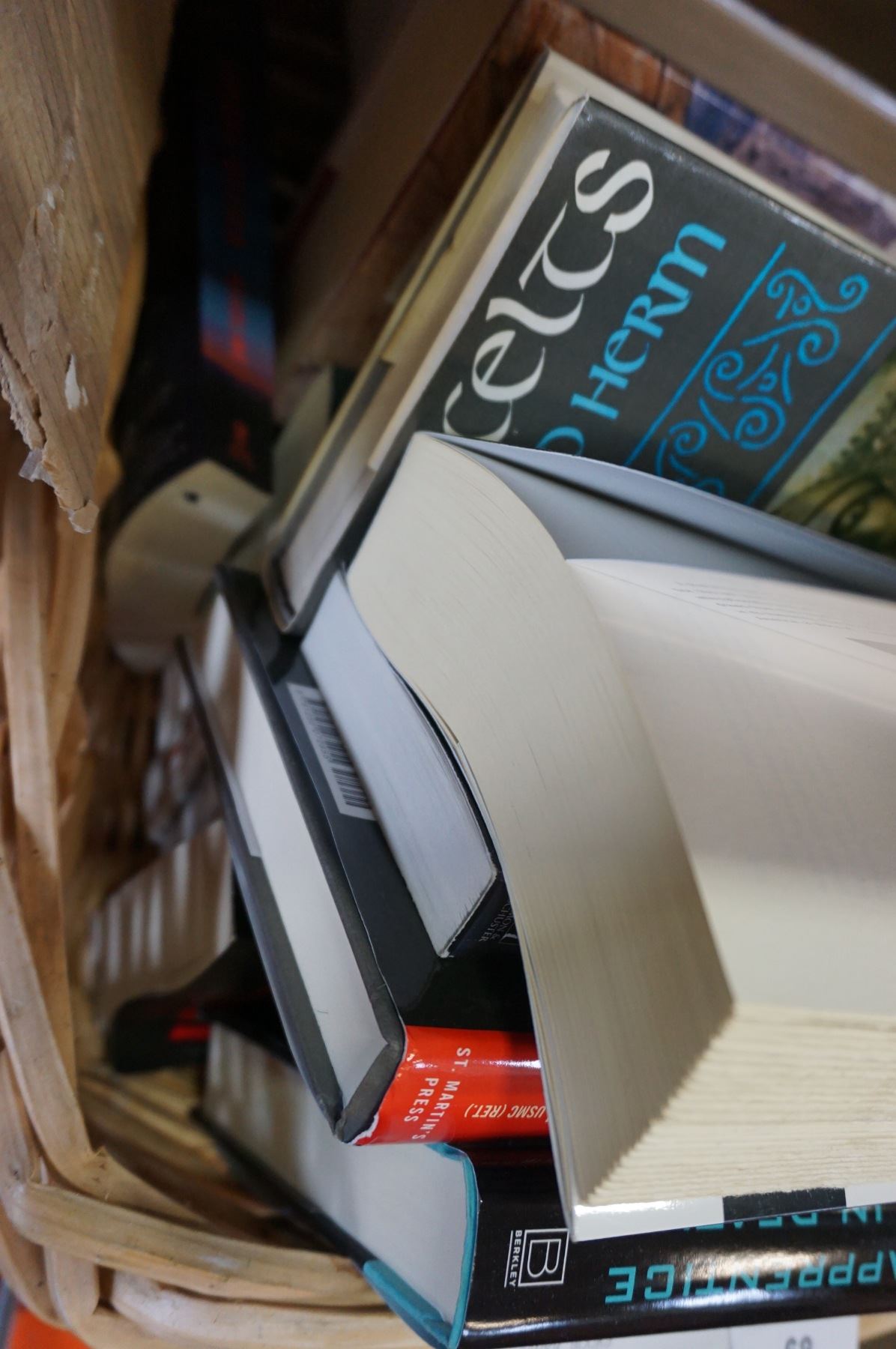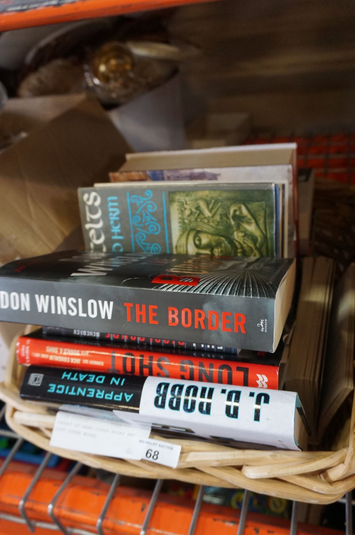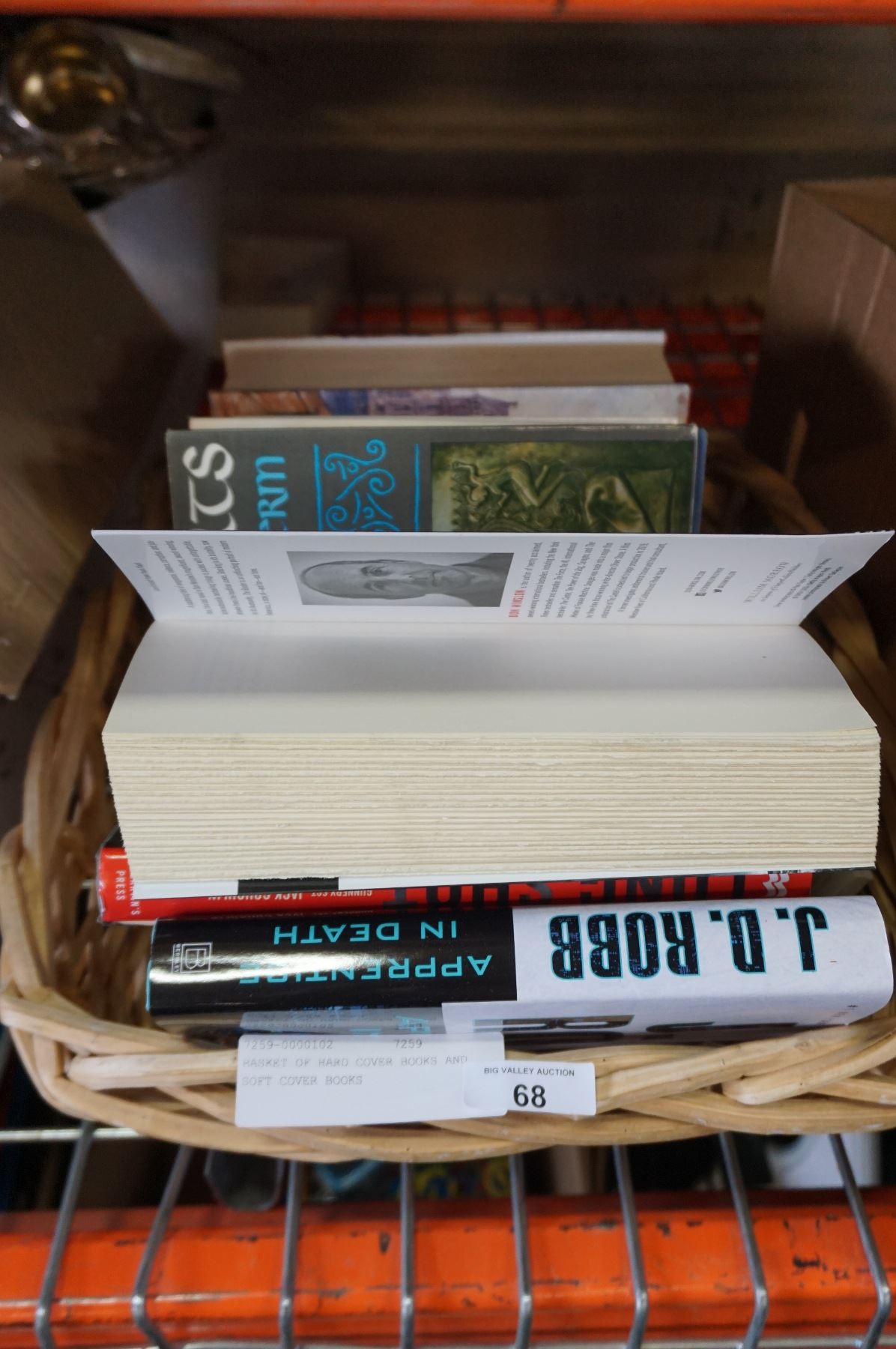BASKET OF HARD COVER BOOKS AND SOFT COVER BOOKS