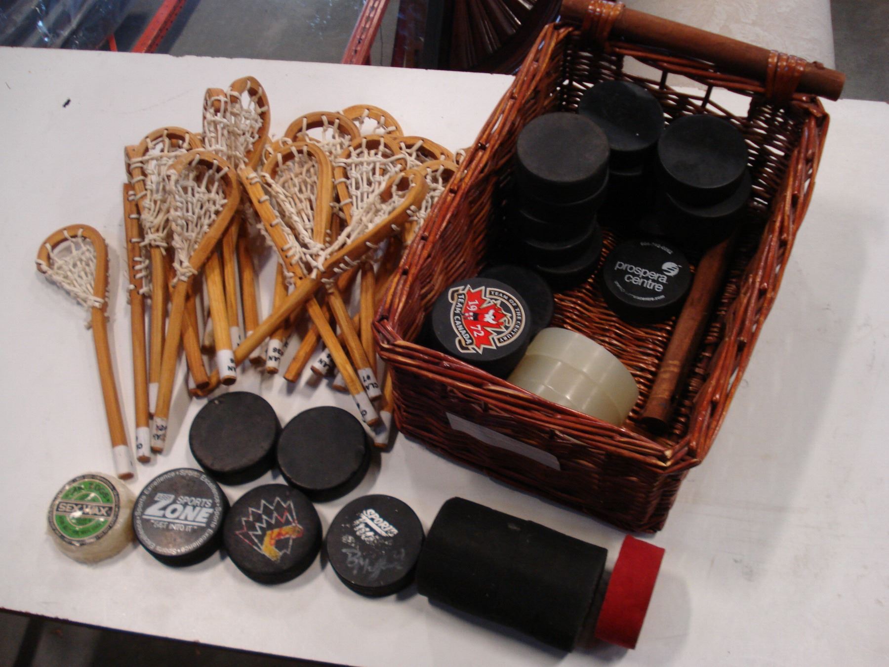 BASKET OF HOCKEY PUCKS MINI LACROSSE STICKS TAPE ETC