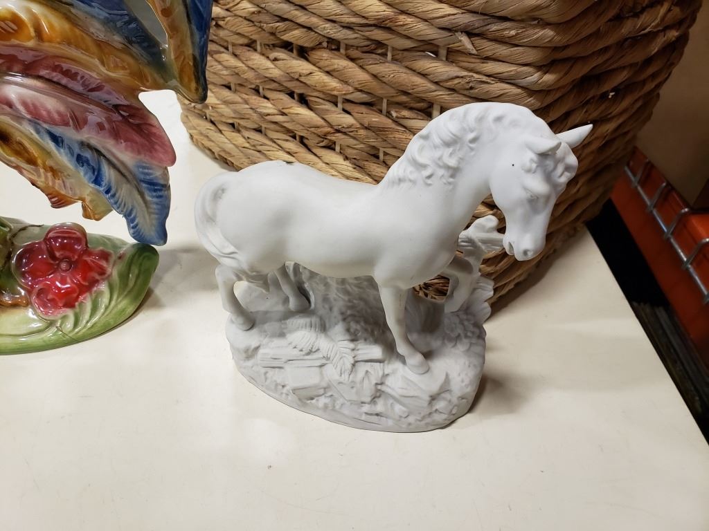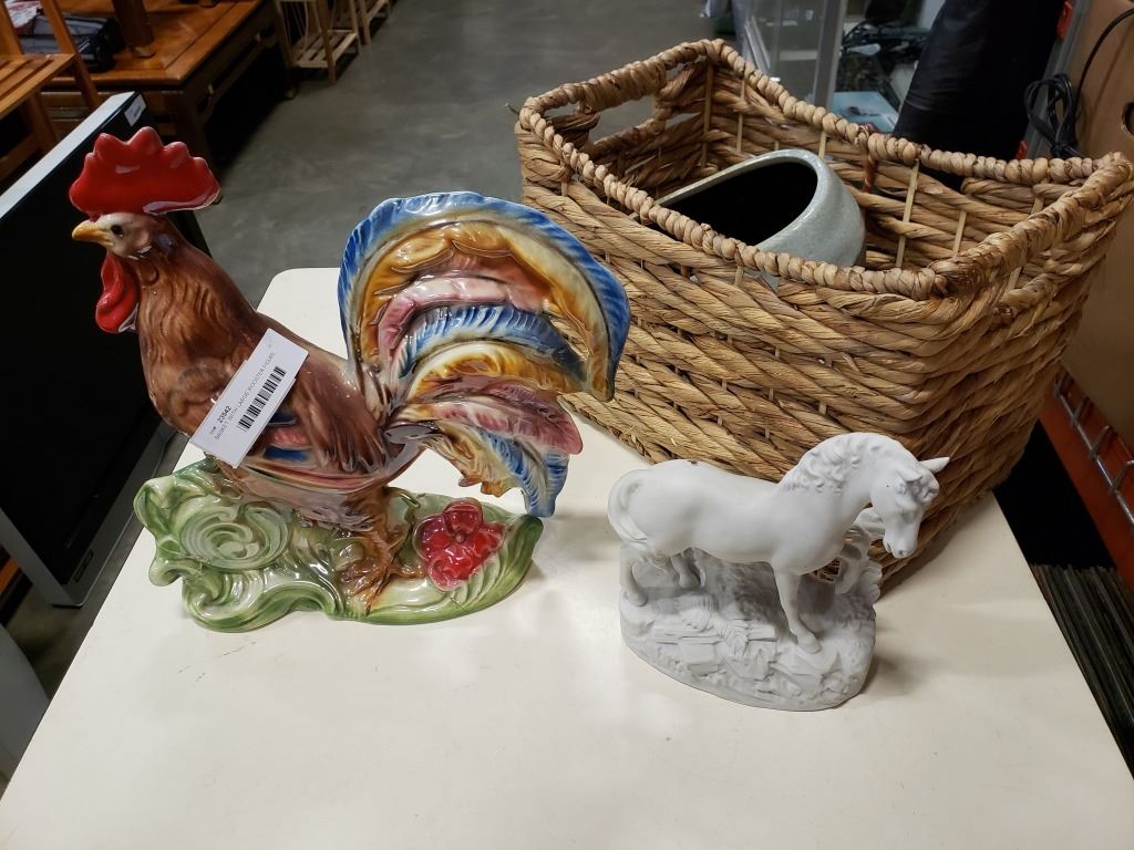BASKET WITH LARGE ROOSTER FIGURE, HORSE FIGURE, BOWL