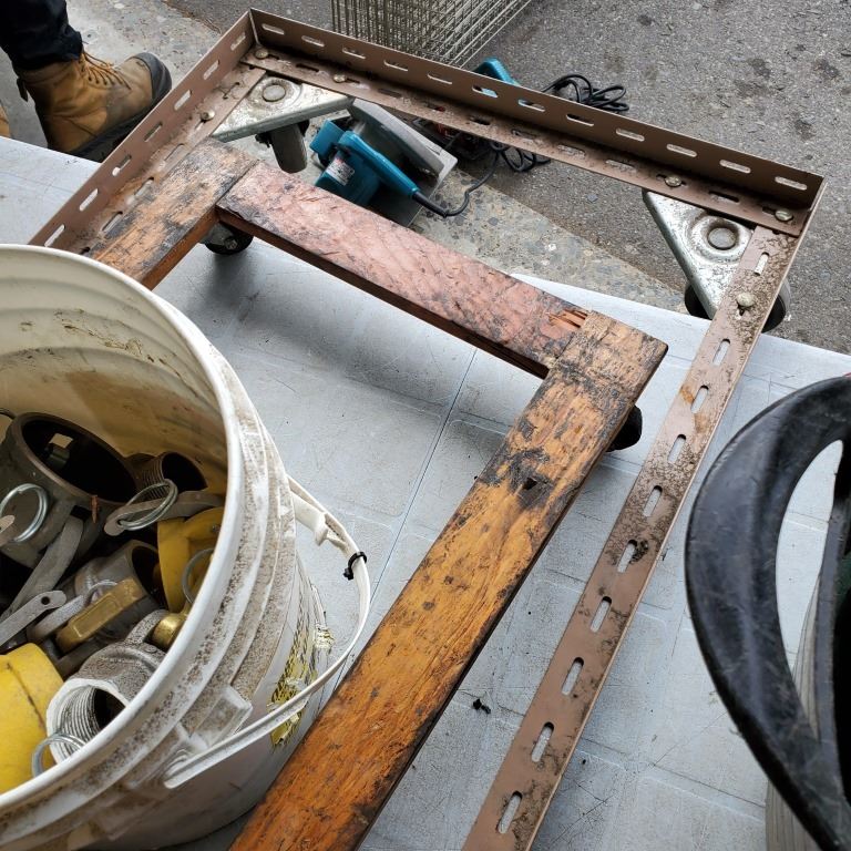 BASKEY OF DRAIN COVERS WITH BUCKET OF WATER PUMP CAPS AND 2 DOLLIES