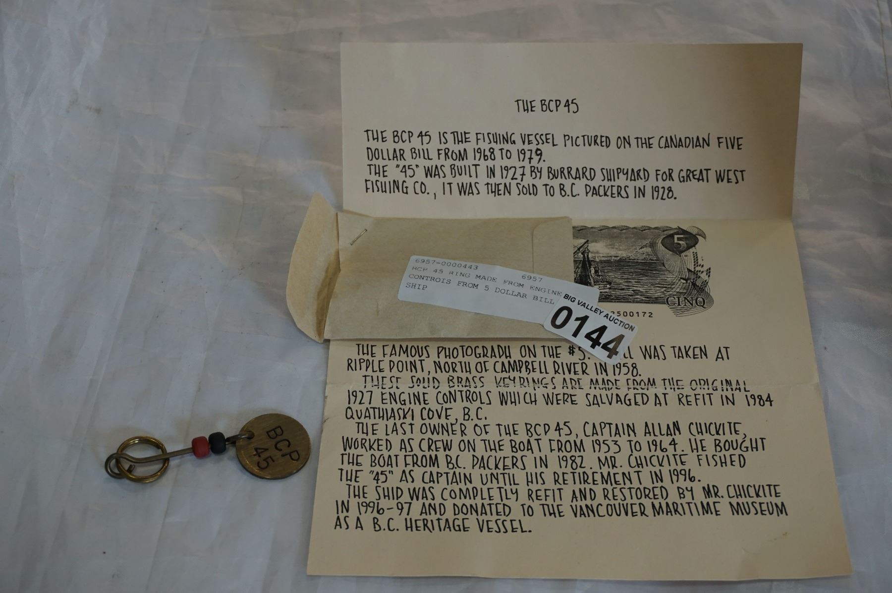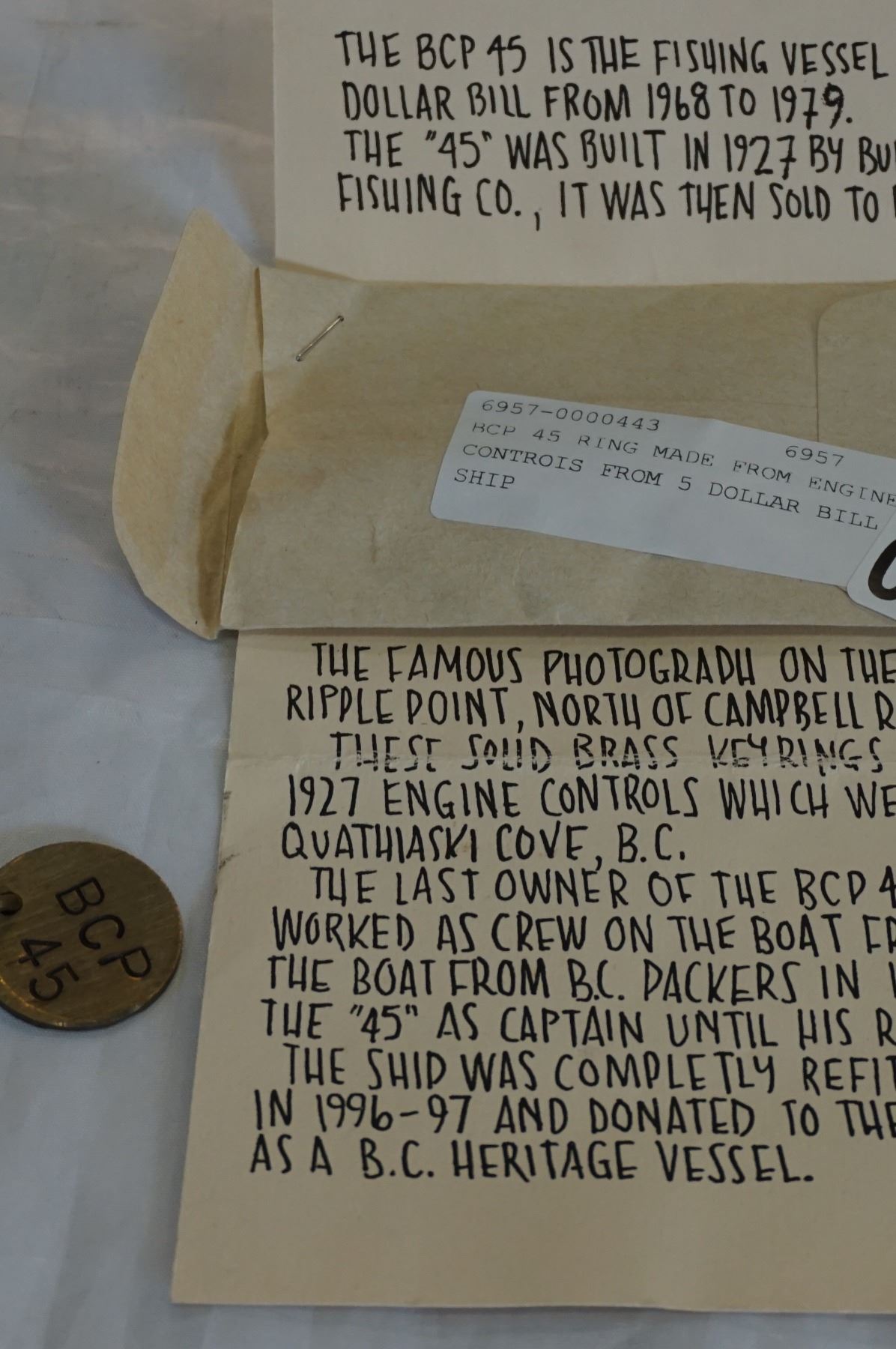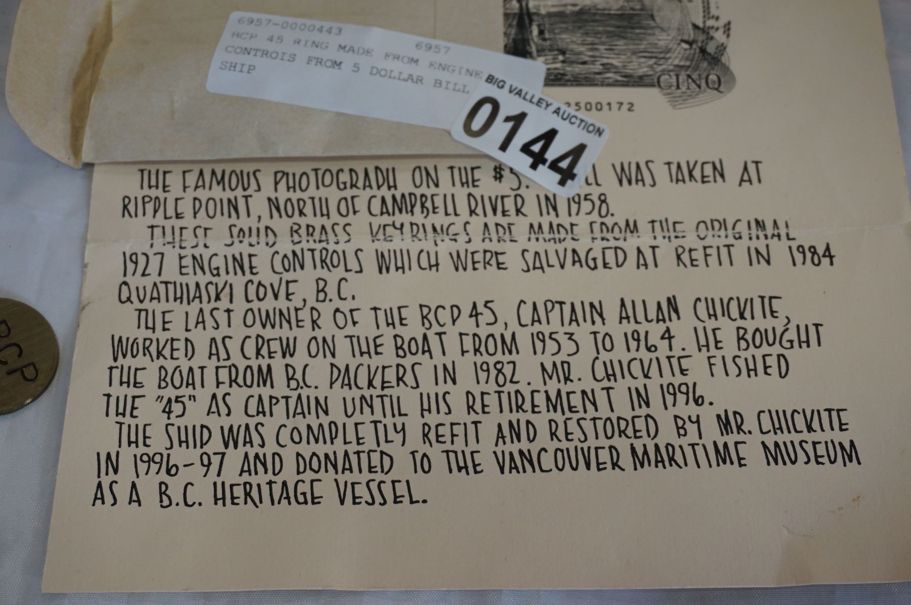 BCP 45 KEY RING MADE FROM ENGINE CONTROLS FROM 5 DOLLAR BILL SHIP