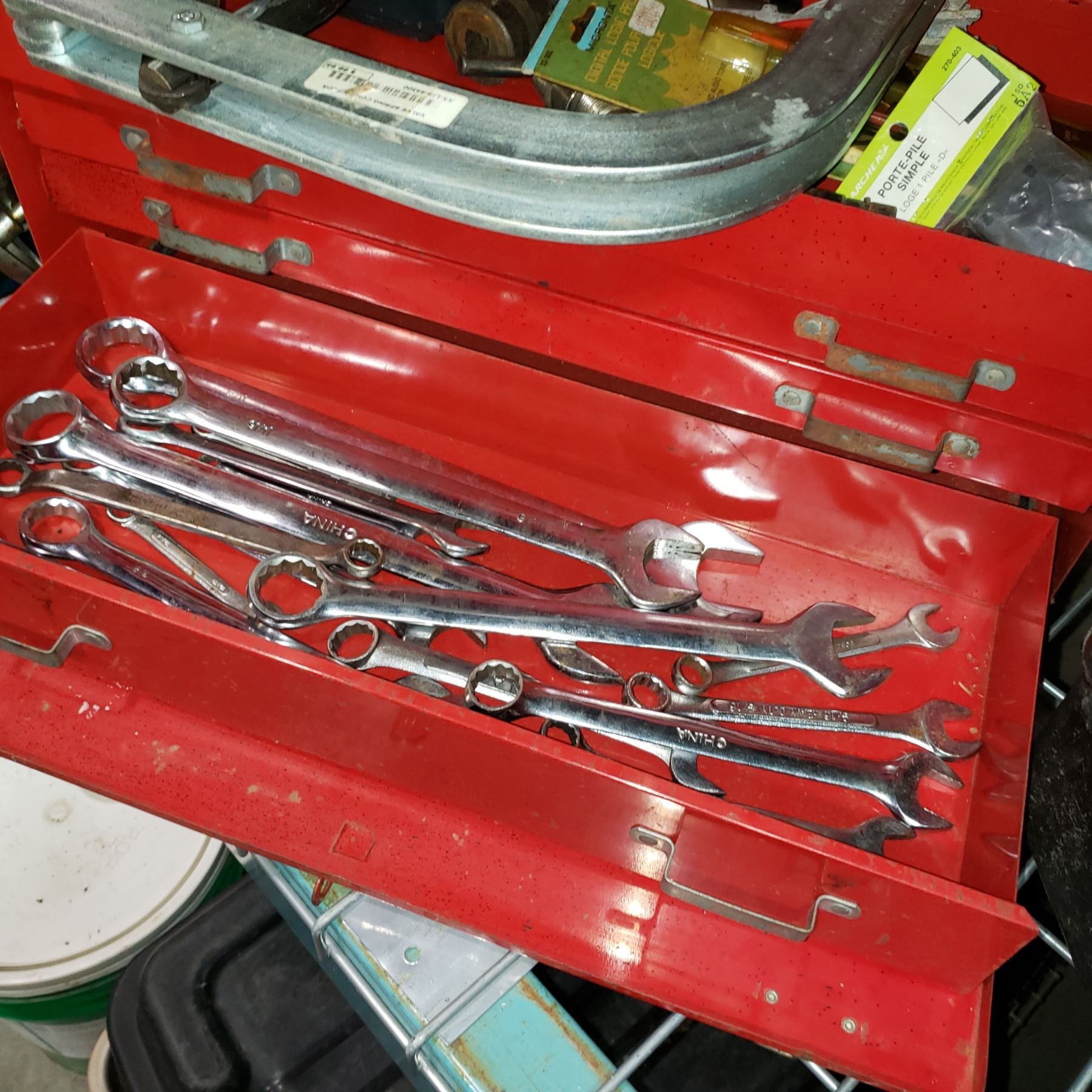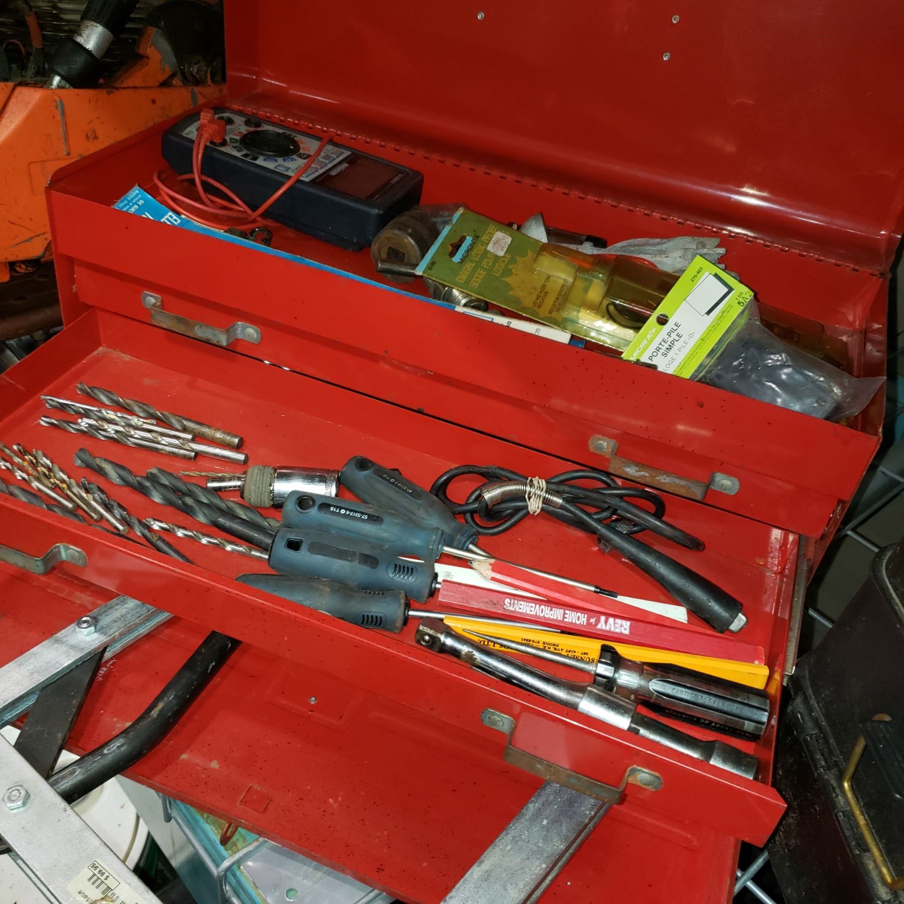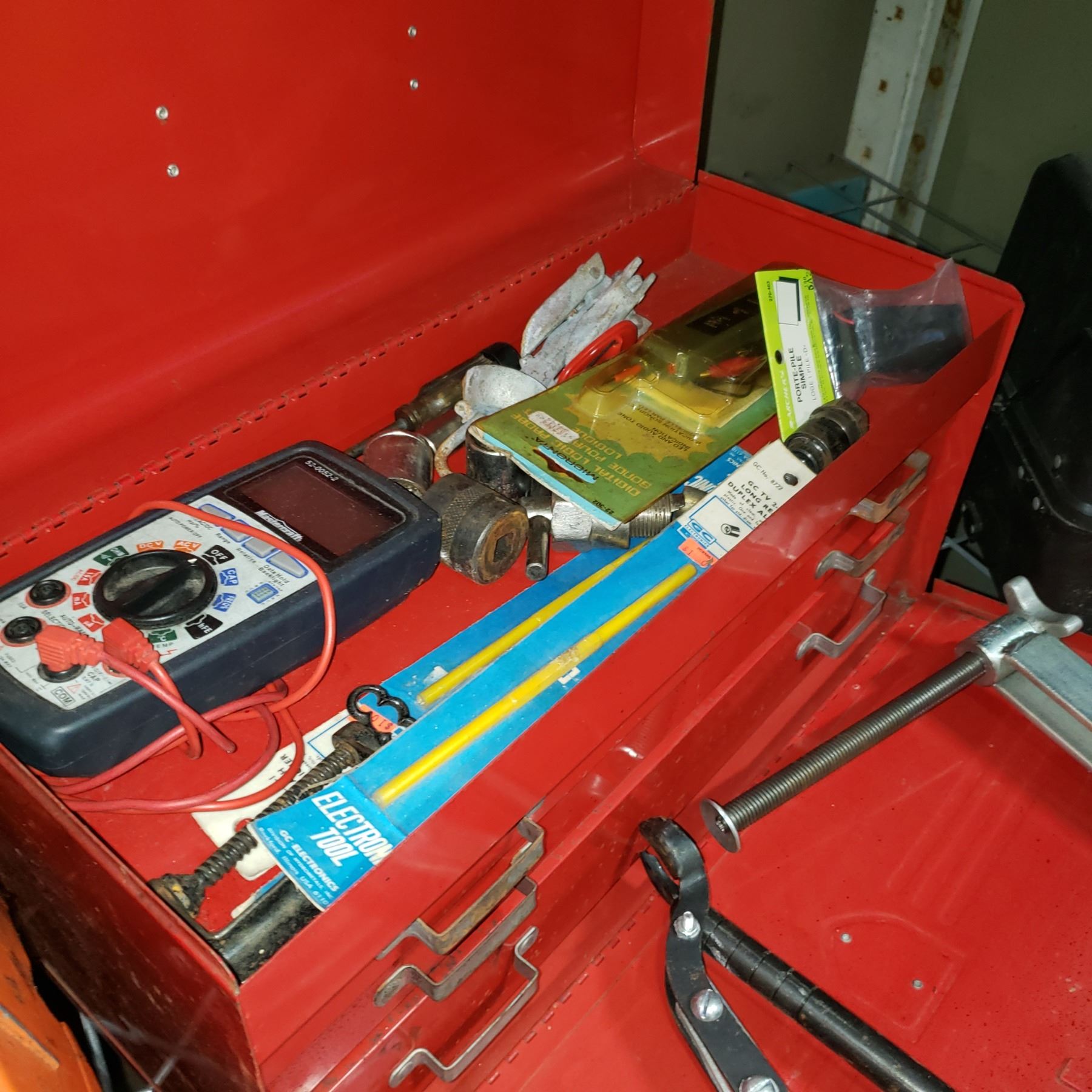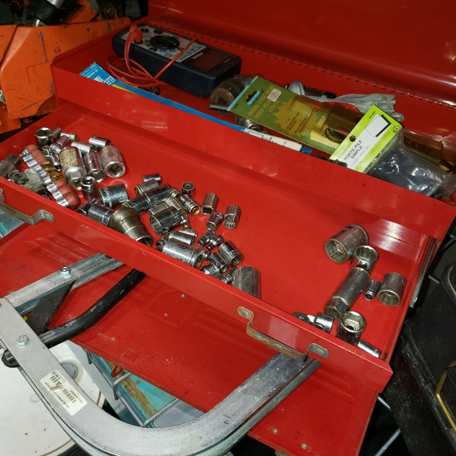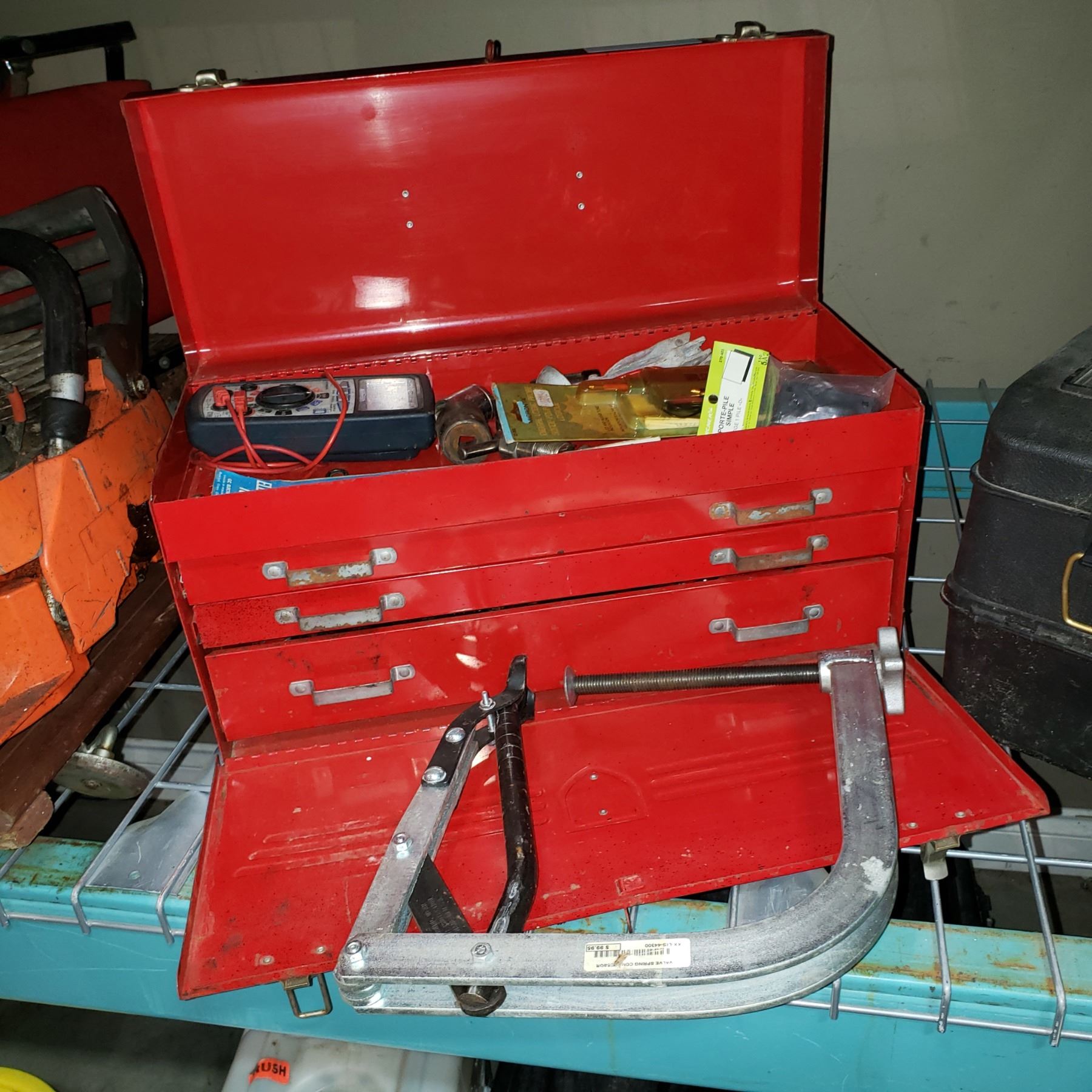 BEACH TOOL CHEST W/ CONTENTS AND VALVE COMPRESSOR
