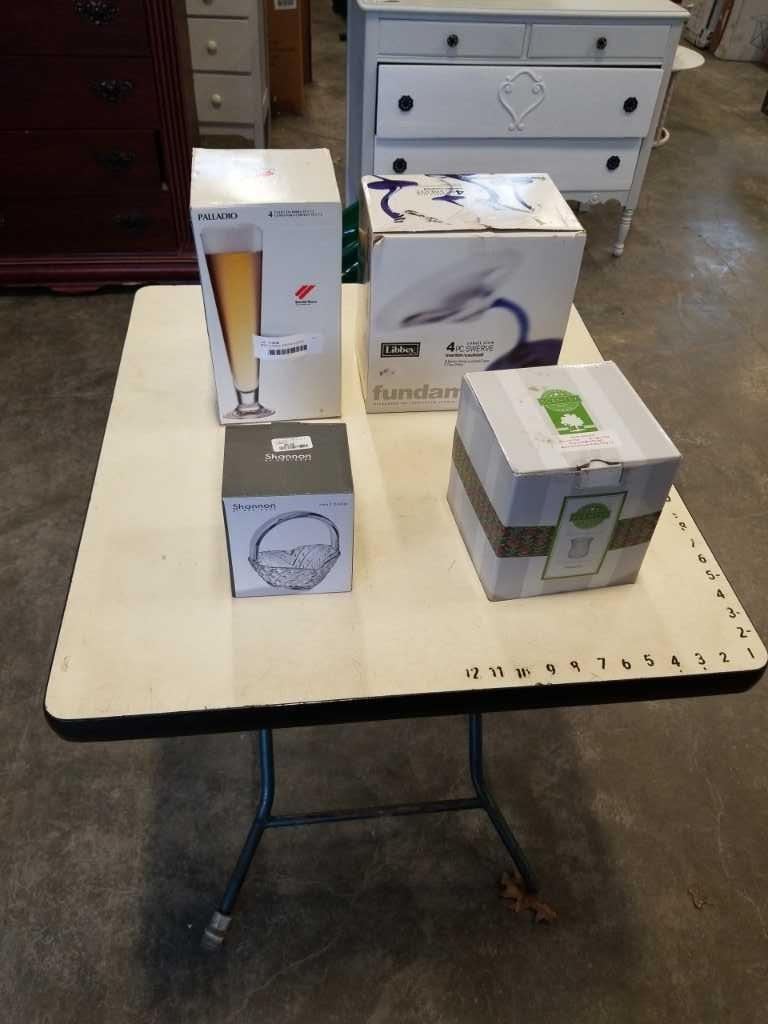 BEER GLASSES, MARTINI GLASSES, SCENTZY ALABASTER AND SHANNON HEART BASKET