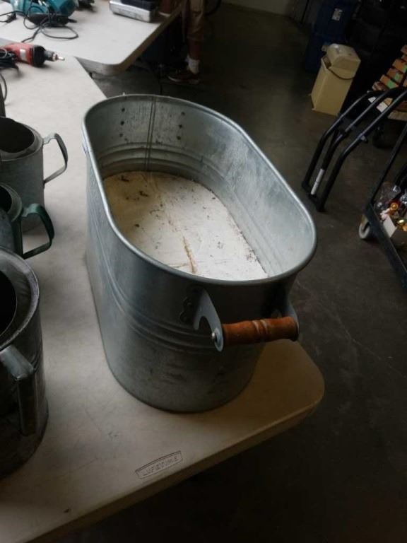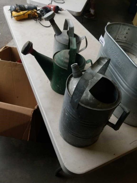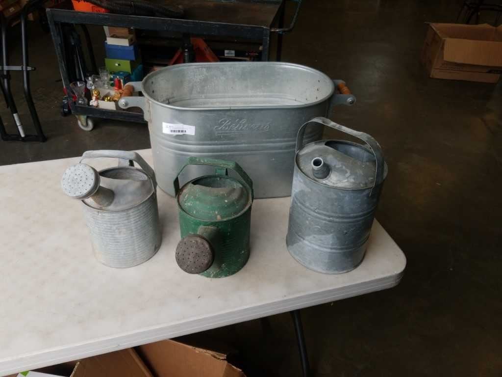 BEHRENS GALVANIZED BUCKET AND 3 GALVANIZED WATERING CANS