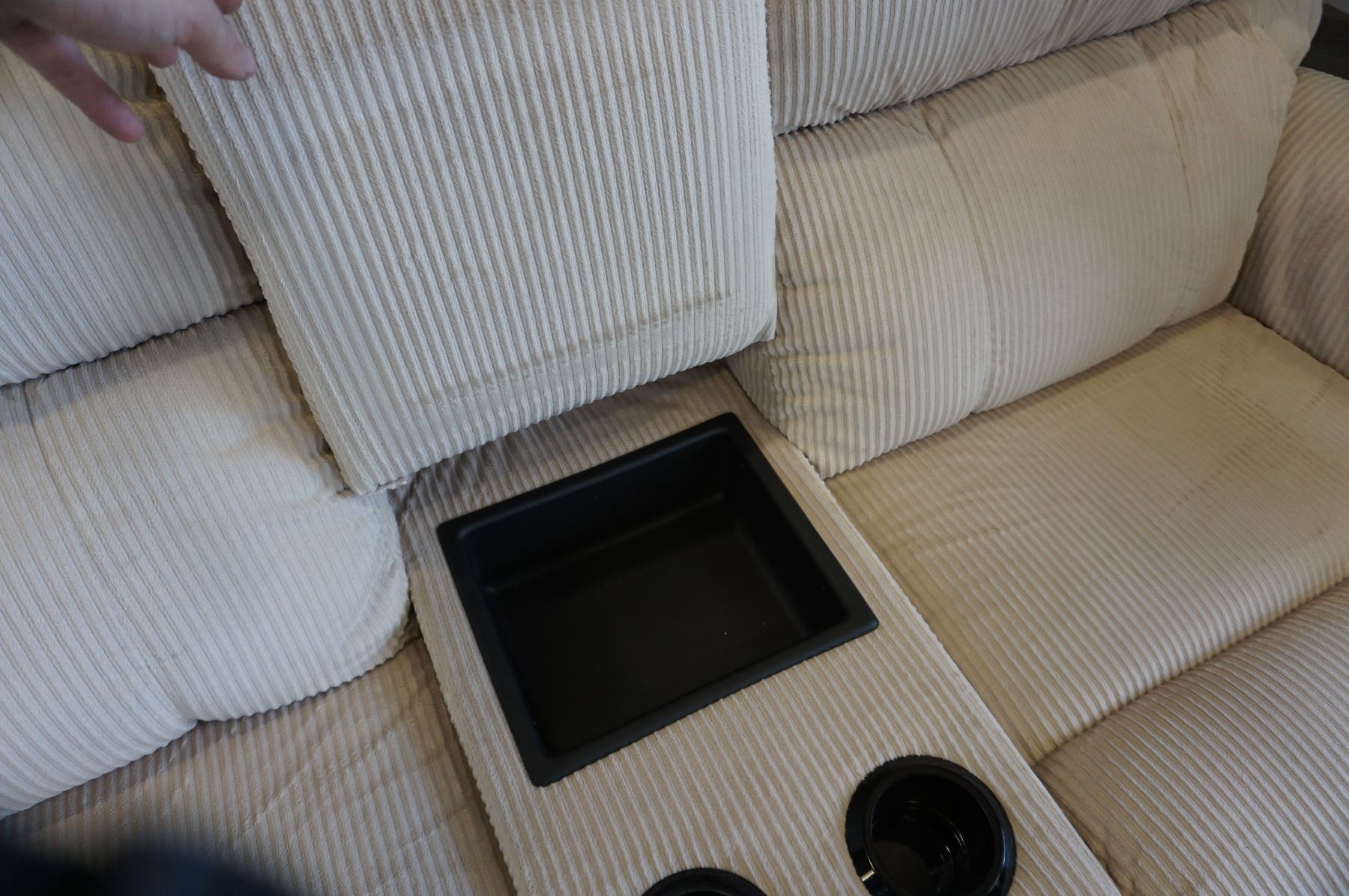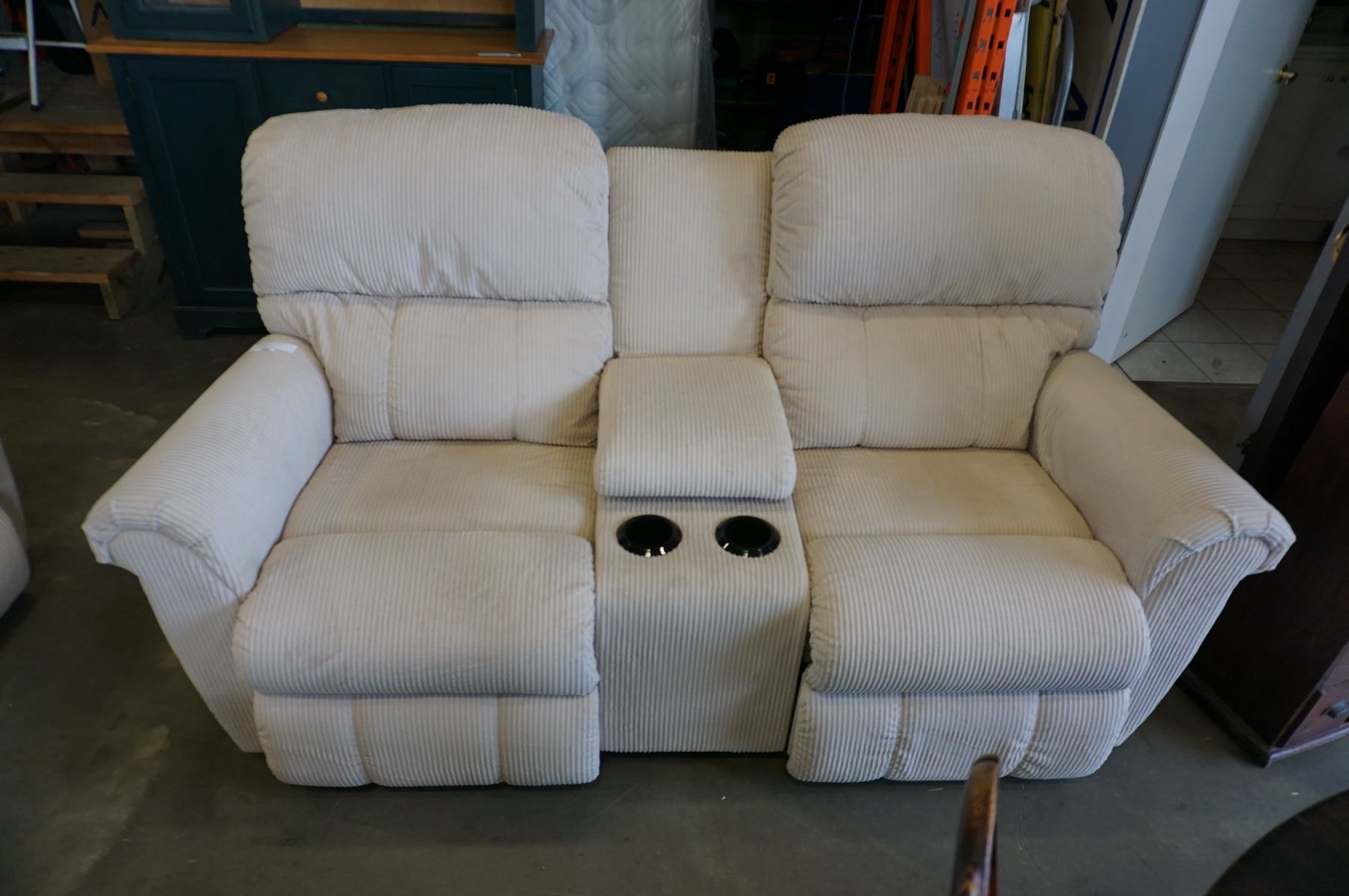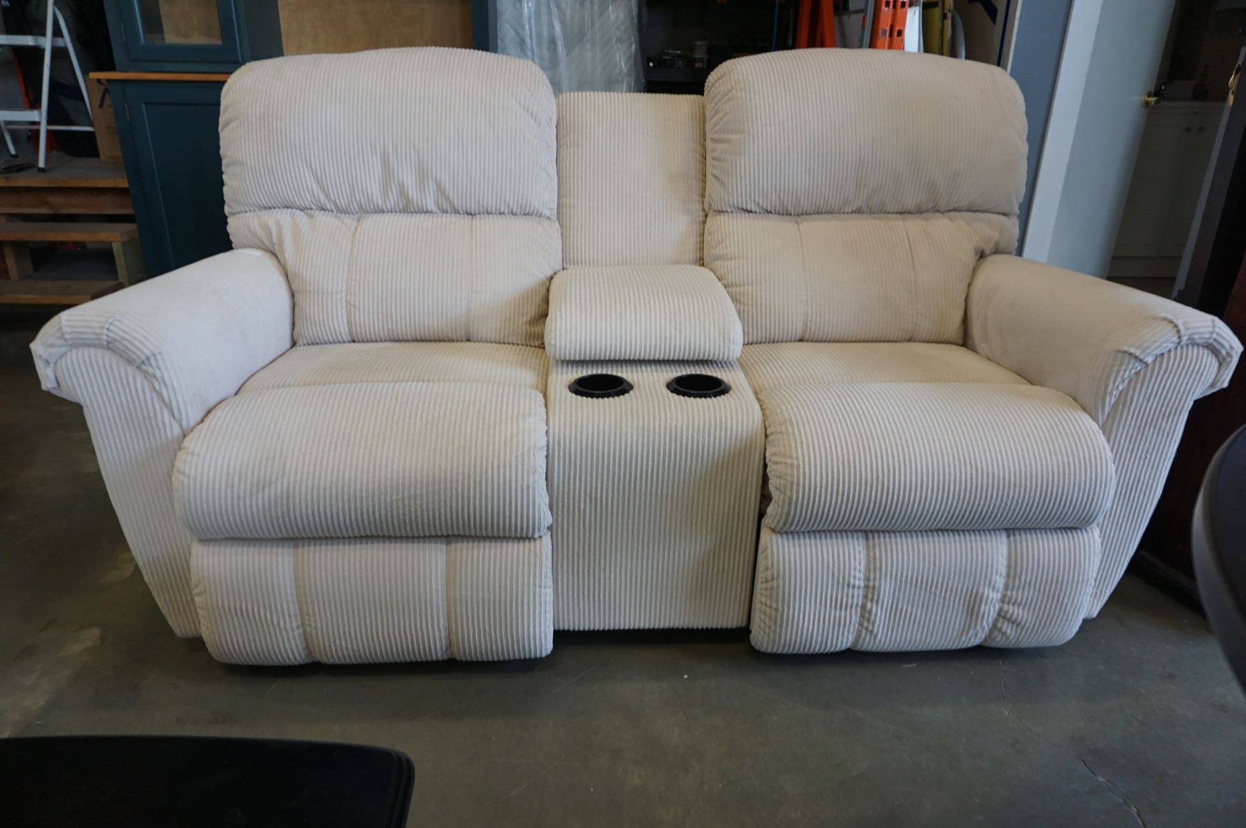 BEIGE FABRIC RECLINING LOVESEAT W/ CONSOLE