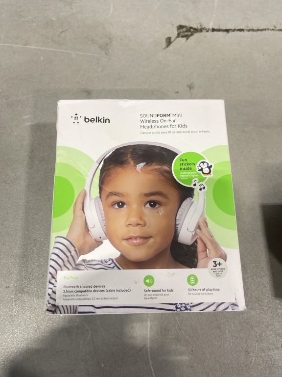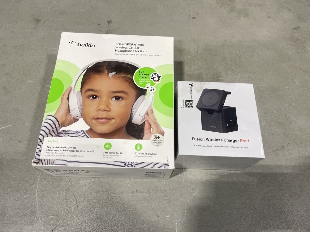 BELKIN SOUNDFORM MINI WIRELESS ON EAR HEADPHONES FOR KIDS, AND FUSION WIRELESS CHARGER PRO 1, 5 IN