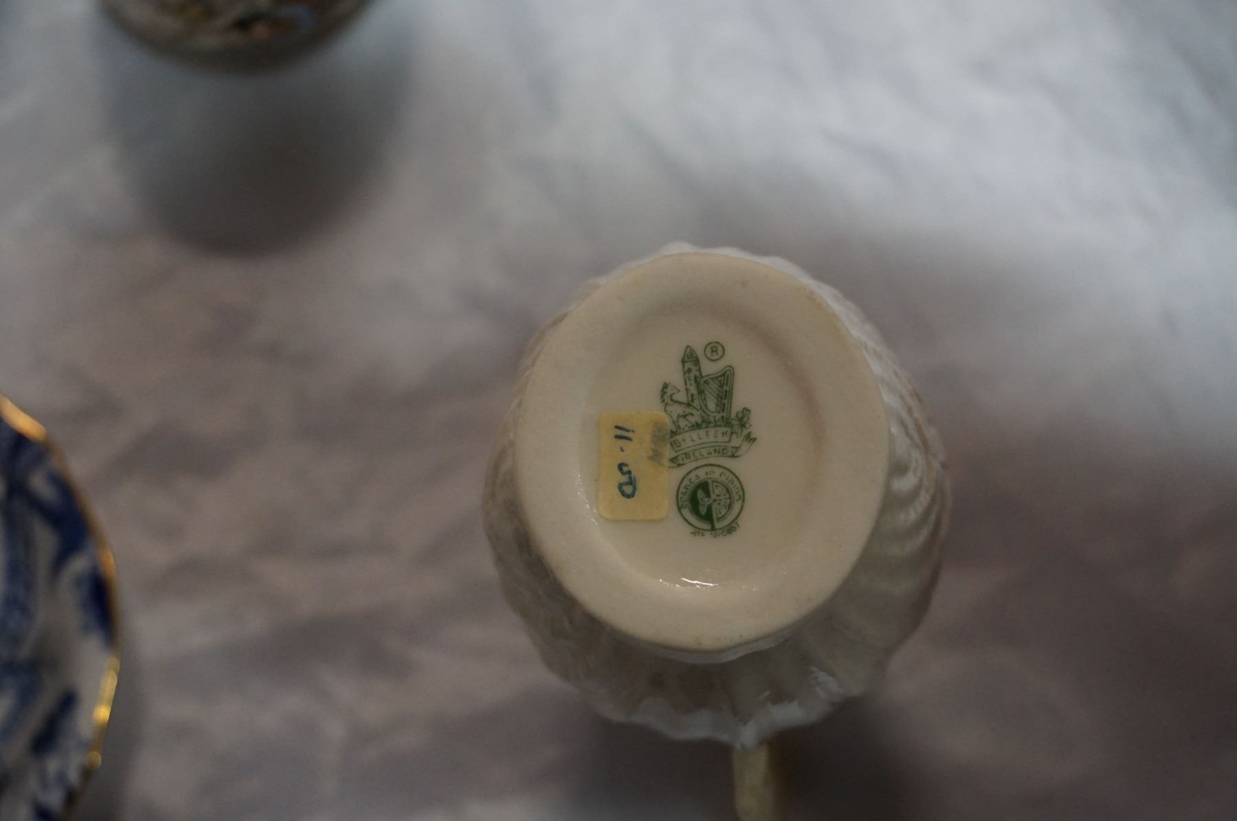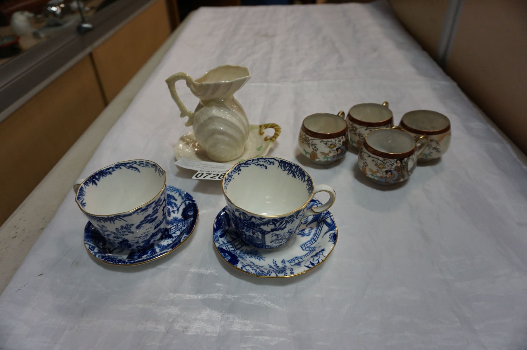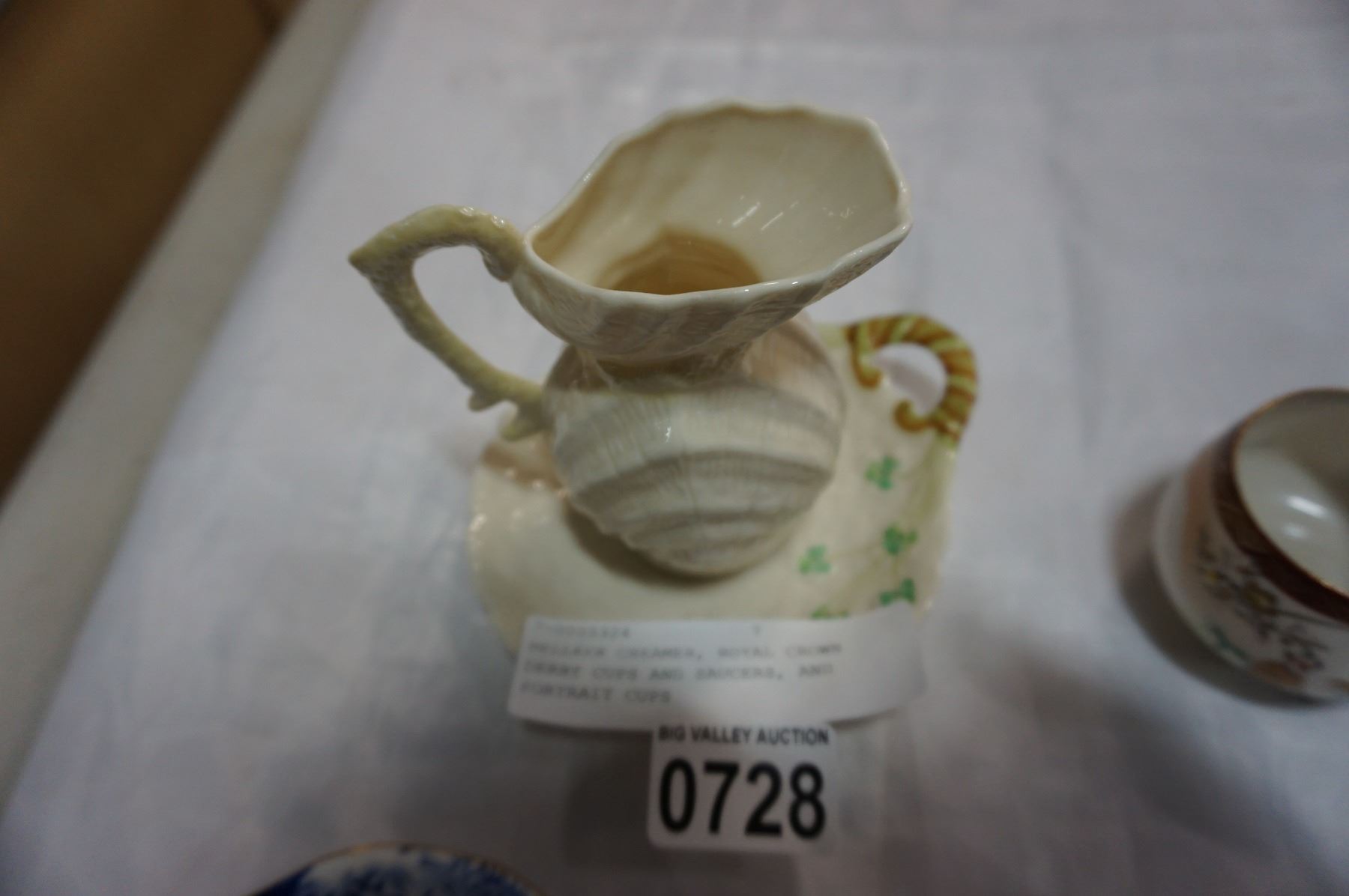 BELLEEK CREAMER, ROYAL CROWN DERBY CUPS AND SAUCERS, AND PORTRAIT CUPS