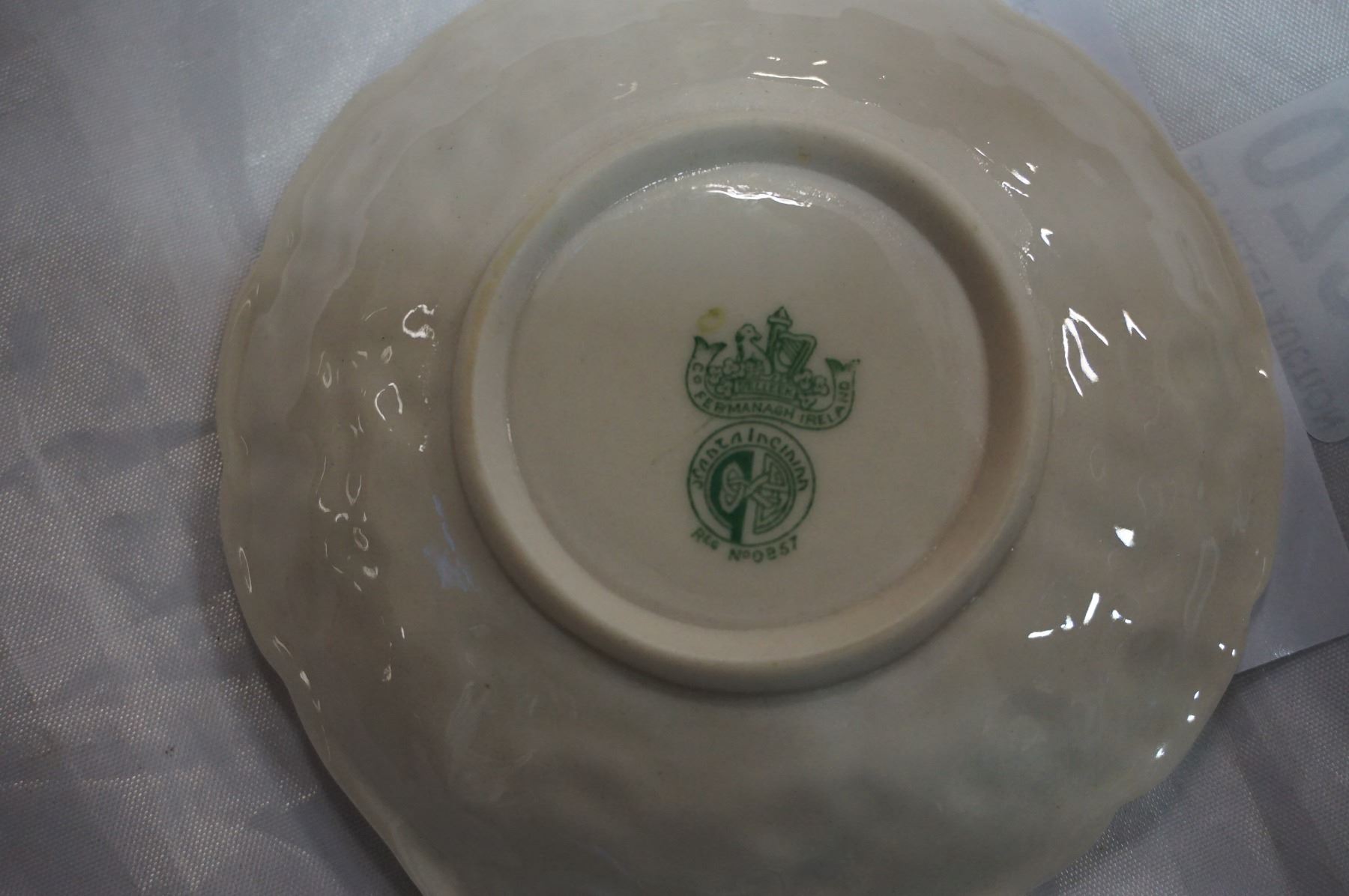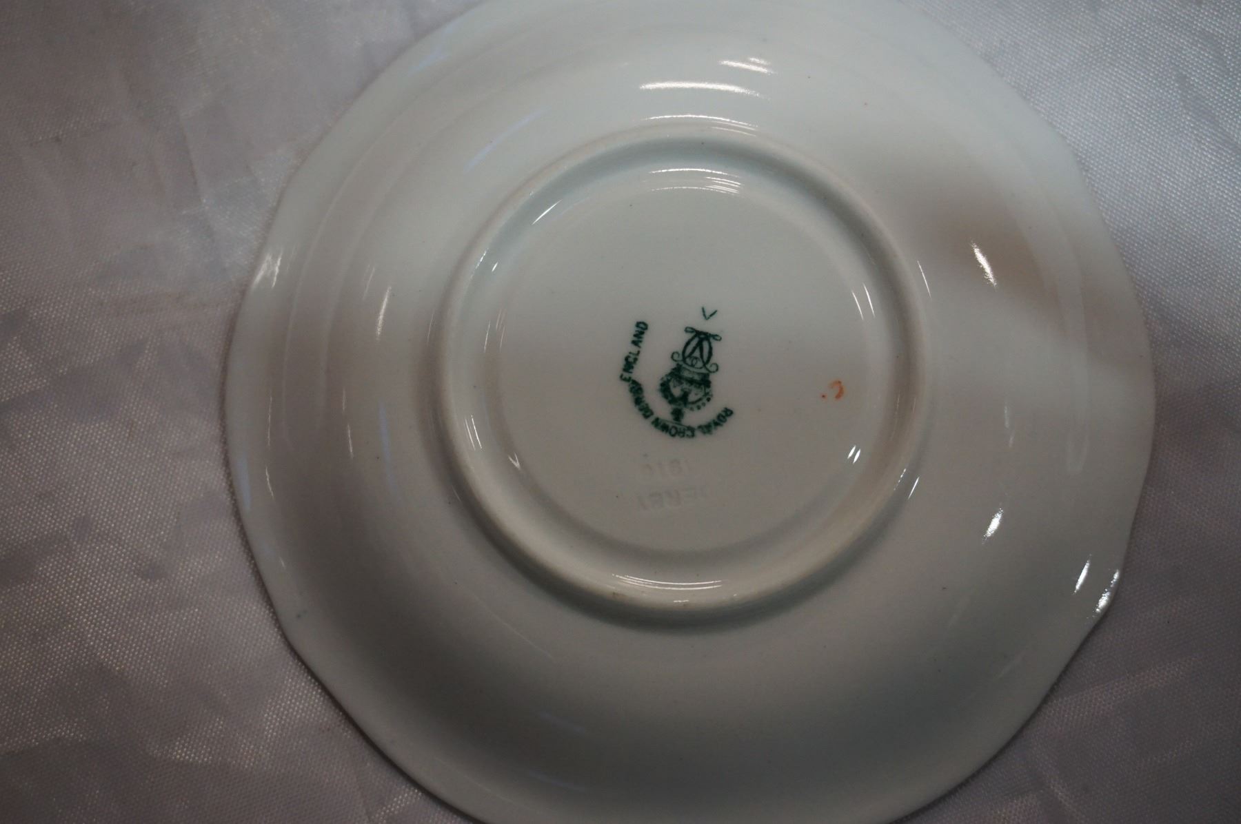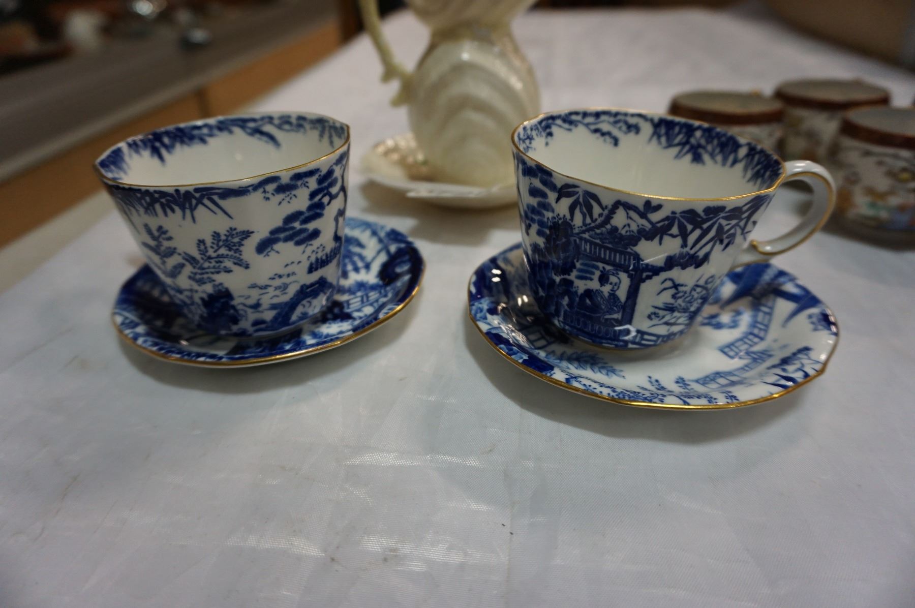 BELLEEK CREAMER, ROYAL CROWN DERBY CUPS AND SAUCERS, AND PORTRAIT CUPS