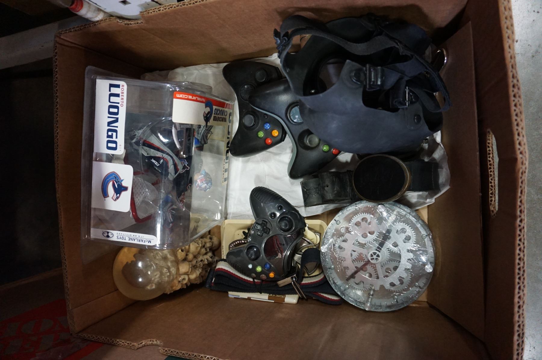 BELT BUCKLES, GAS MASK, CLOCK, XBOX CONTROLLERS, AND LUANGO FIGURE