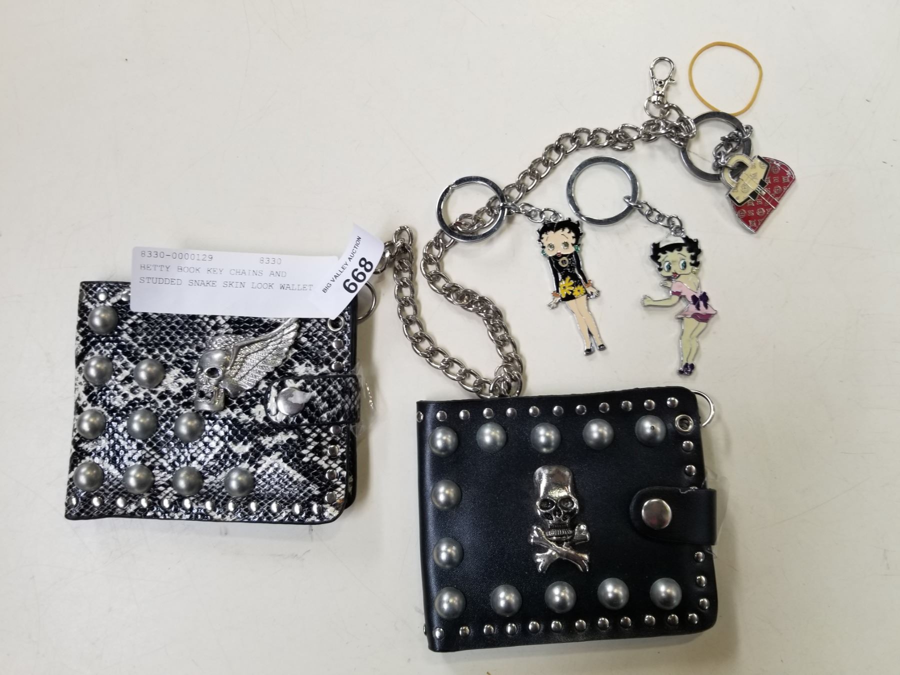 BETTY BOOP KEY CHAINS AND STUDDED SNAKE SKIN LOOK WALLET