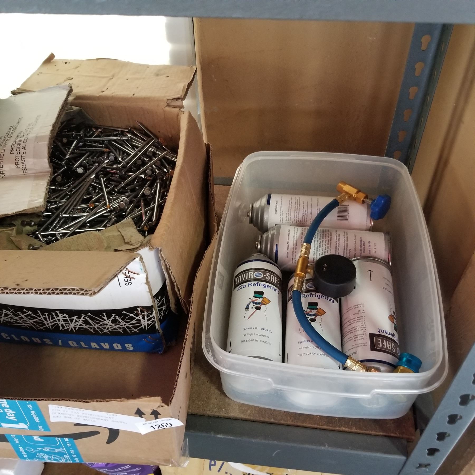 BIN OF 22A REFRIDGERANT, DURACOOL REFRIDGERANT GAUGE, AND BOX OF NAILS