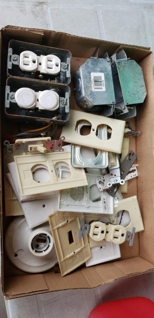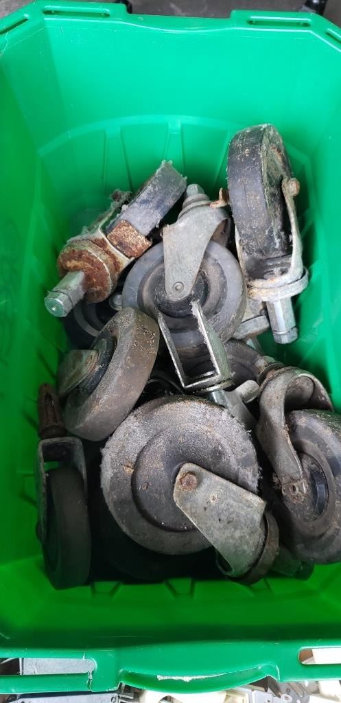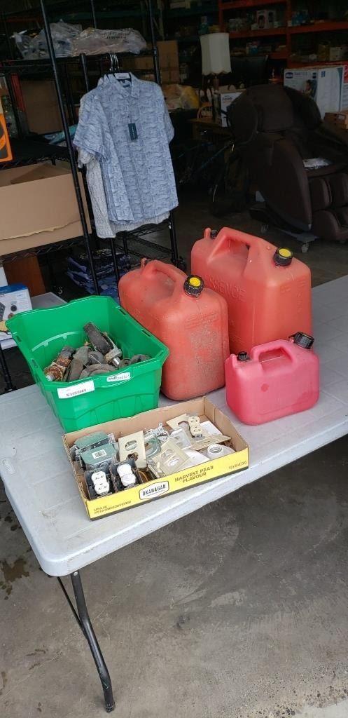 BIN OF CASTORS, ELECTRICAL OUTLETS, COVERS AND 3 JERRY CANS