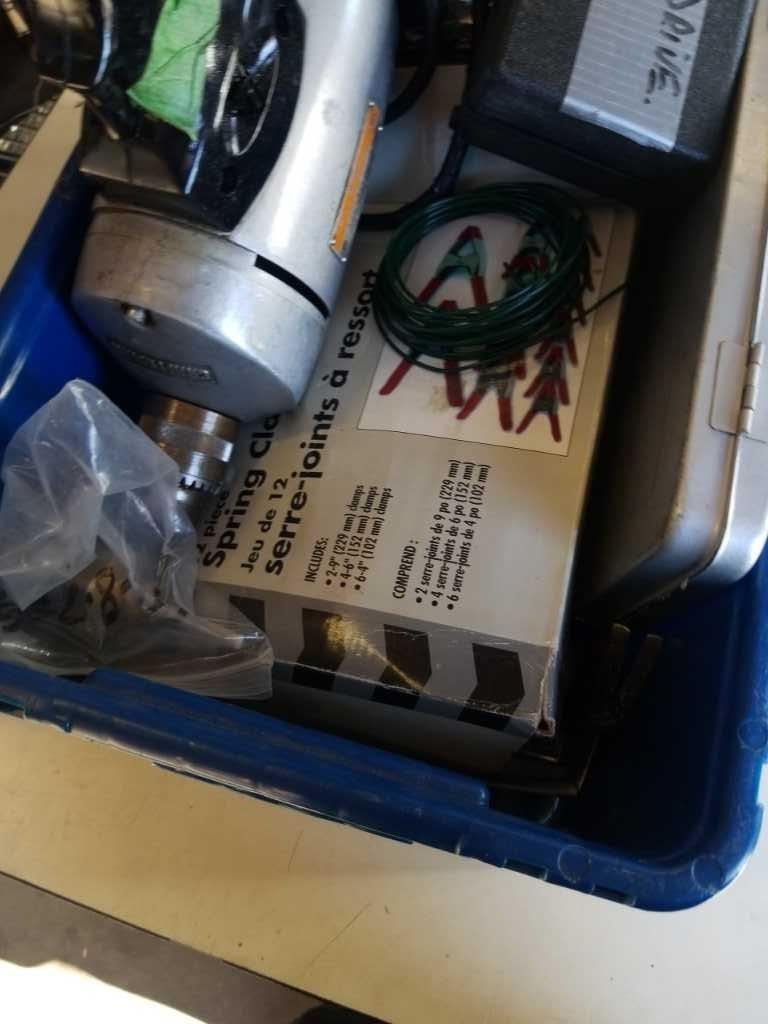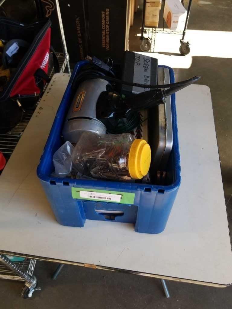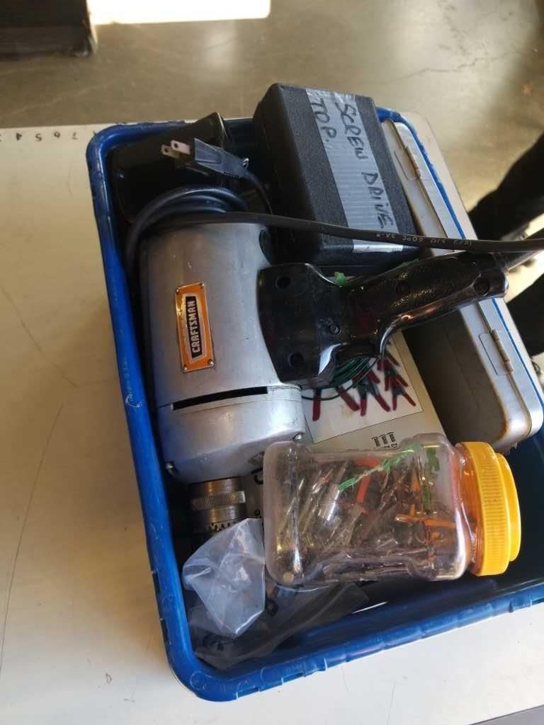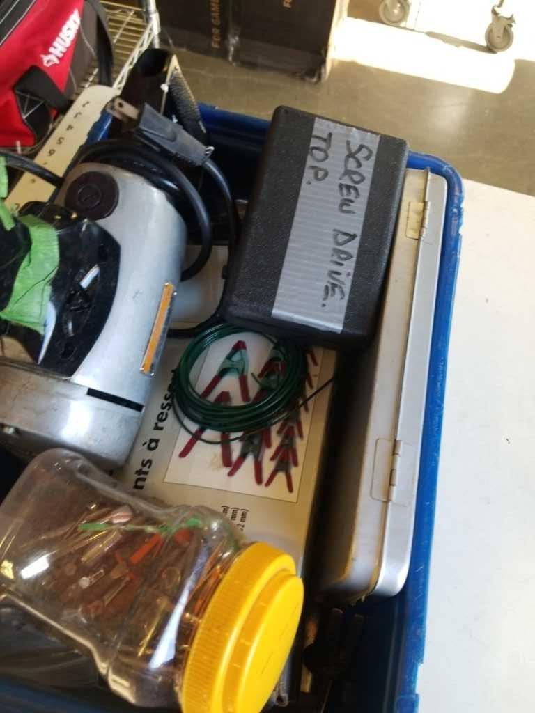 BIN OF HARDWARE FASTENERS, ELECTRIC DRILL AND MORE