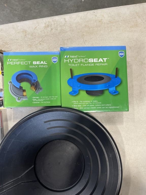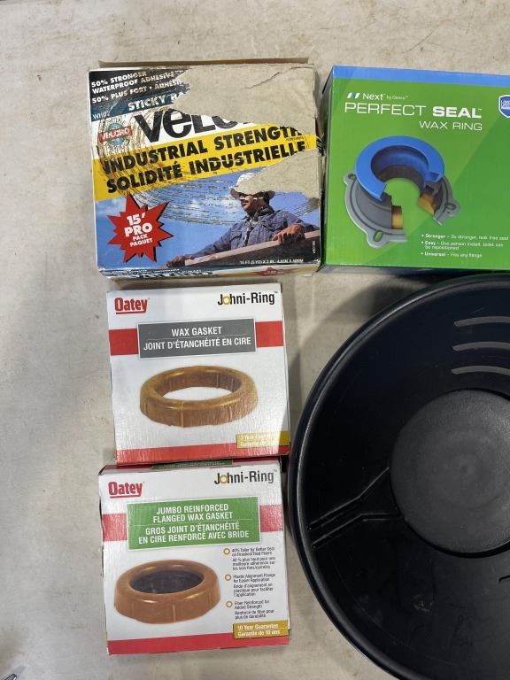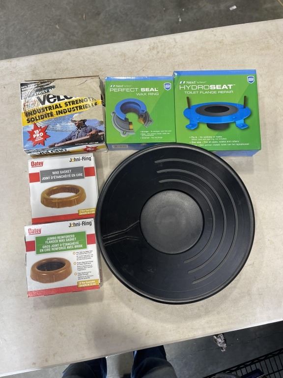 BIN OF TOILET INSTALLATION RINGS AND GOLD PAN