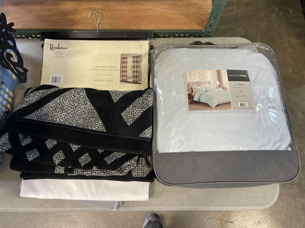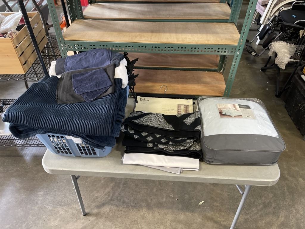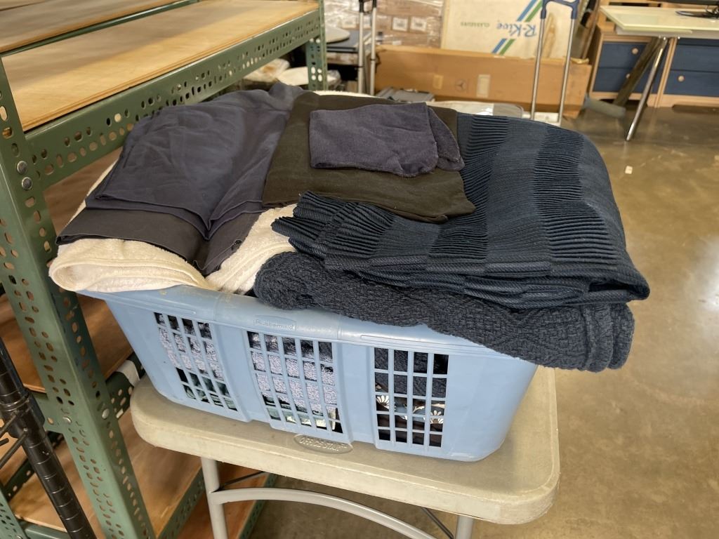 BIN OF TOWELS, BEDDING + NEW CUTAINS