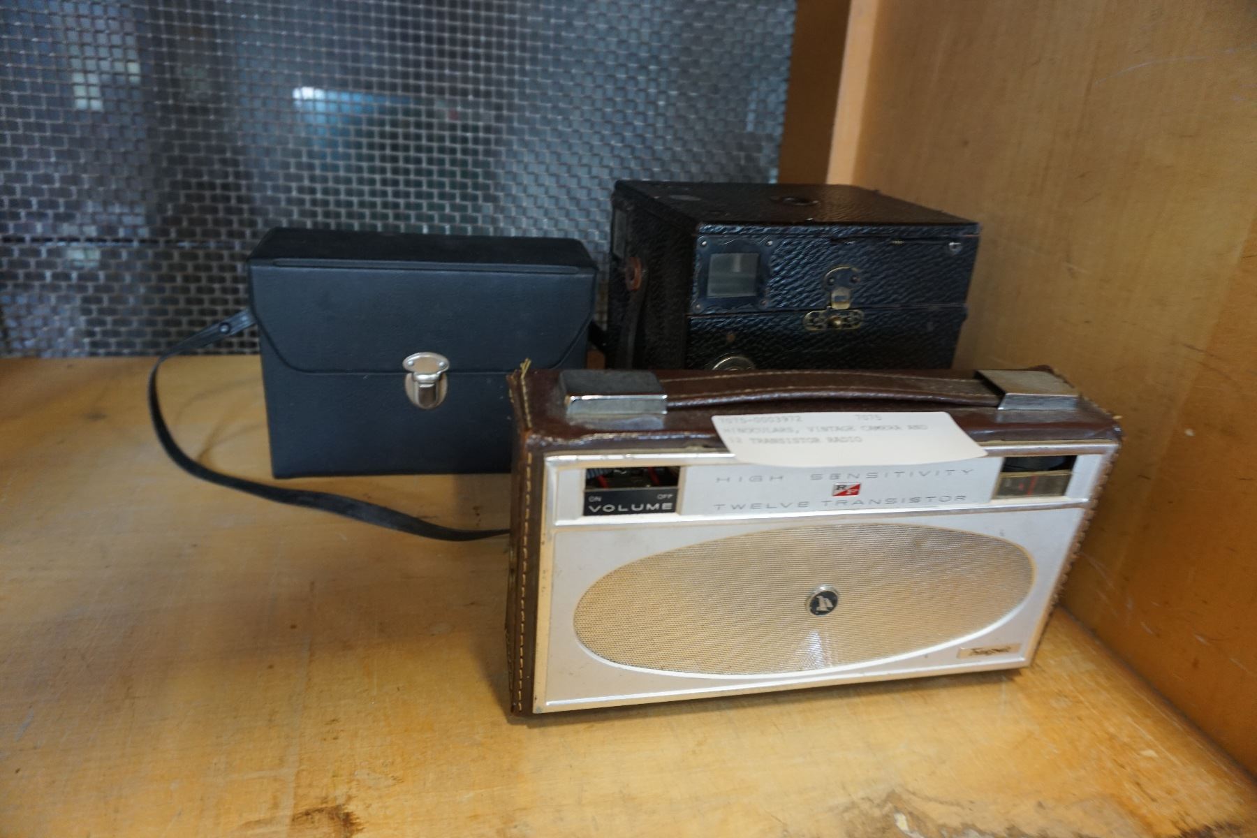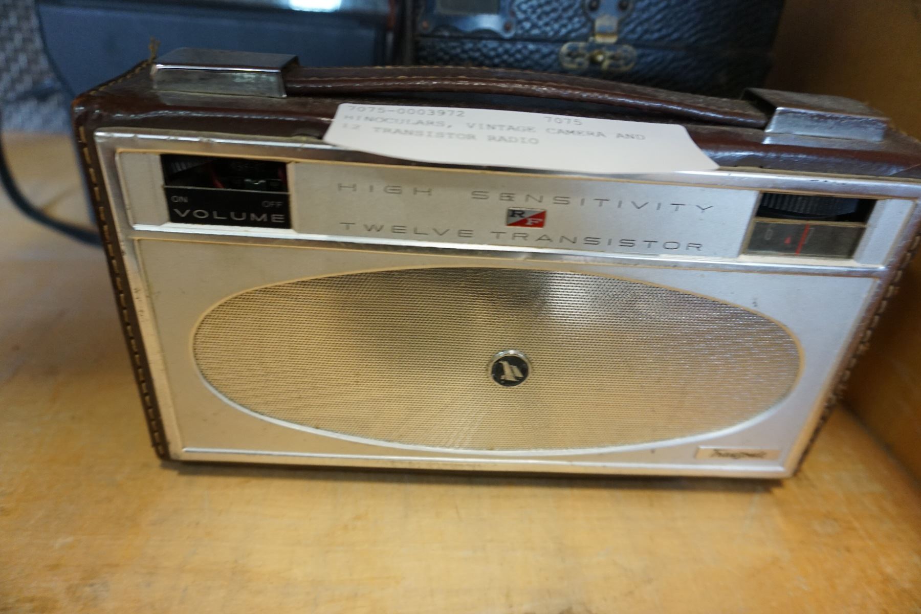 BINOCULARS, VINTAGE CAMERA AND 12 TRANSISTOR RADIO