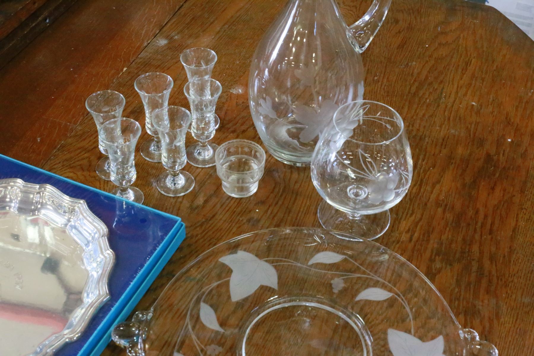 BIRKS COMMEMORATIVE PLATE IN ORGINAL BOX AND VINTAGE ETCHED GLASS DECANTER SET SERVING PLATTER AND GLASSES