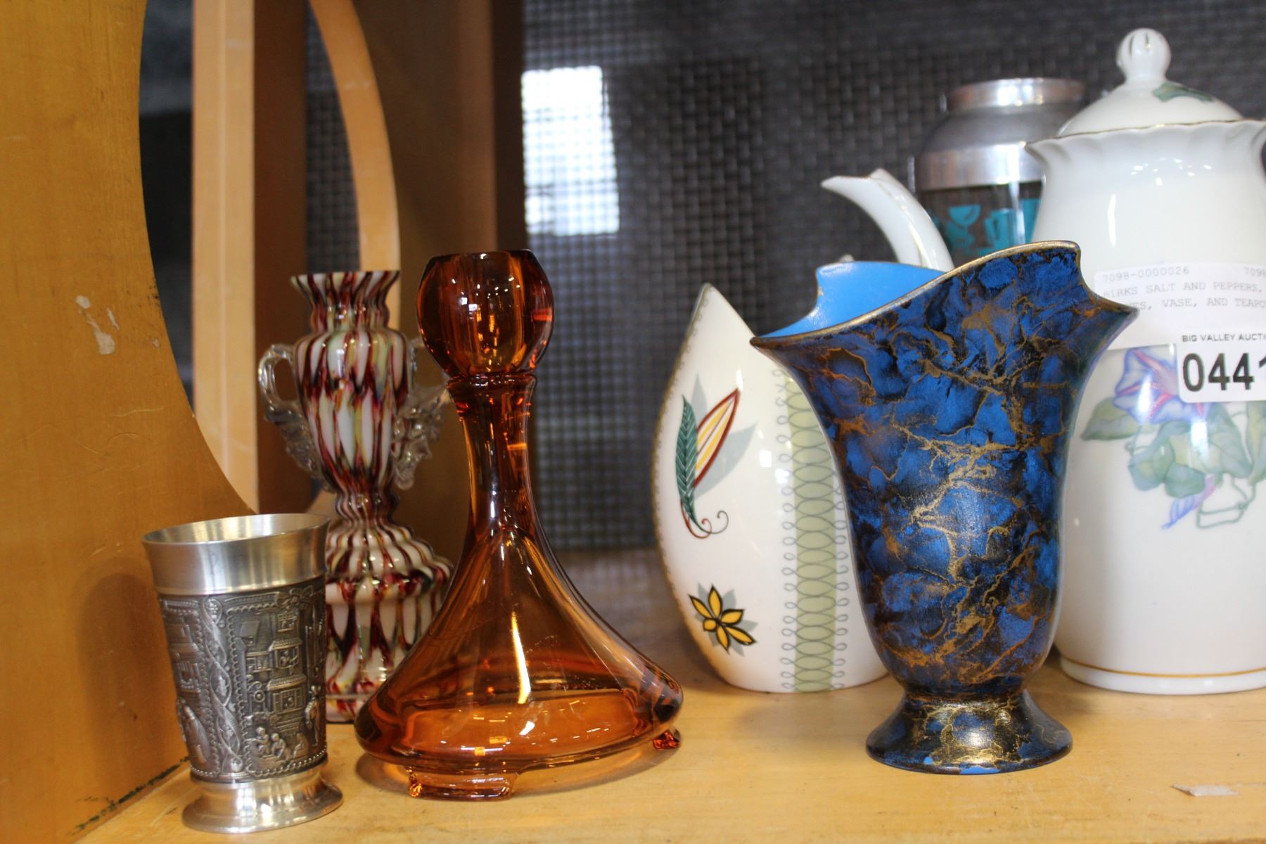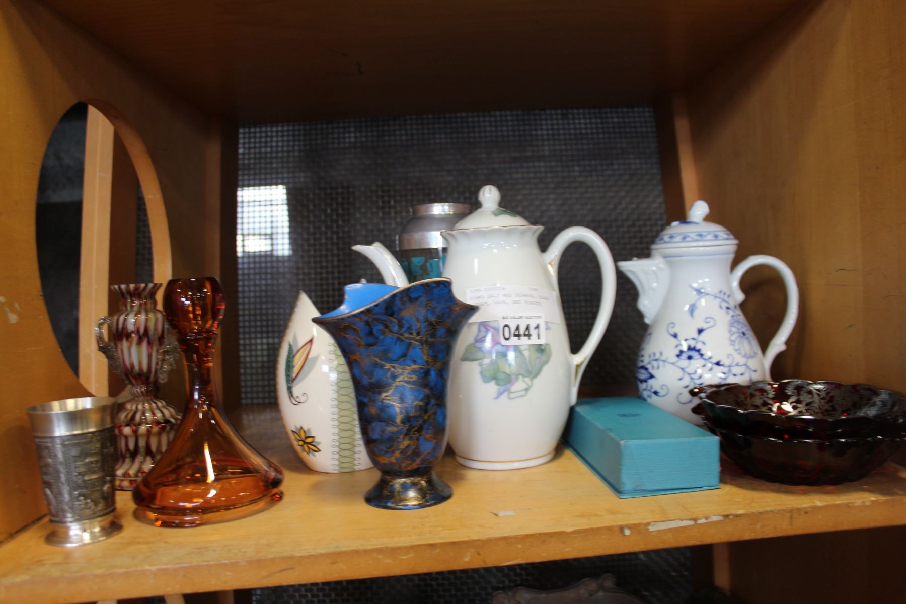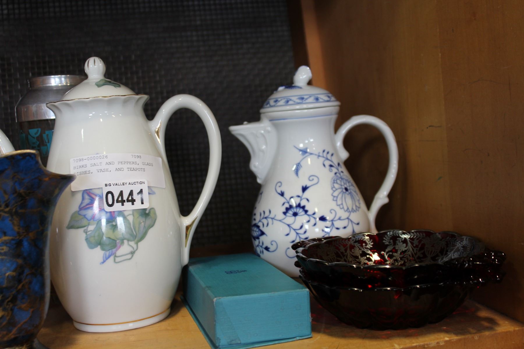 BIRKS SALT AND PEPPERS, GLASS DISHES, VASE, AND TEAPOTS