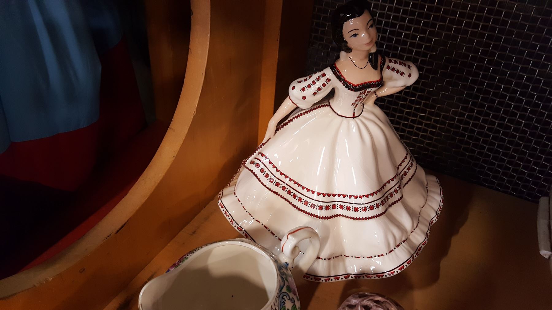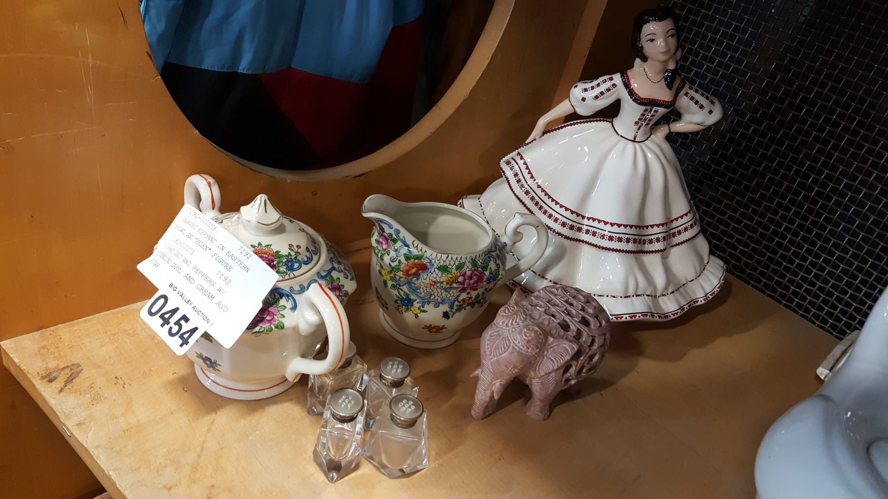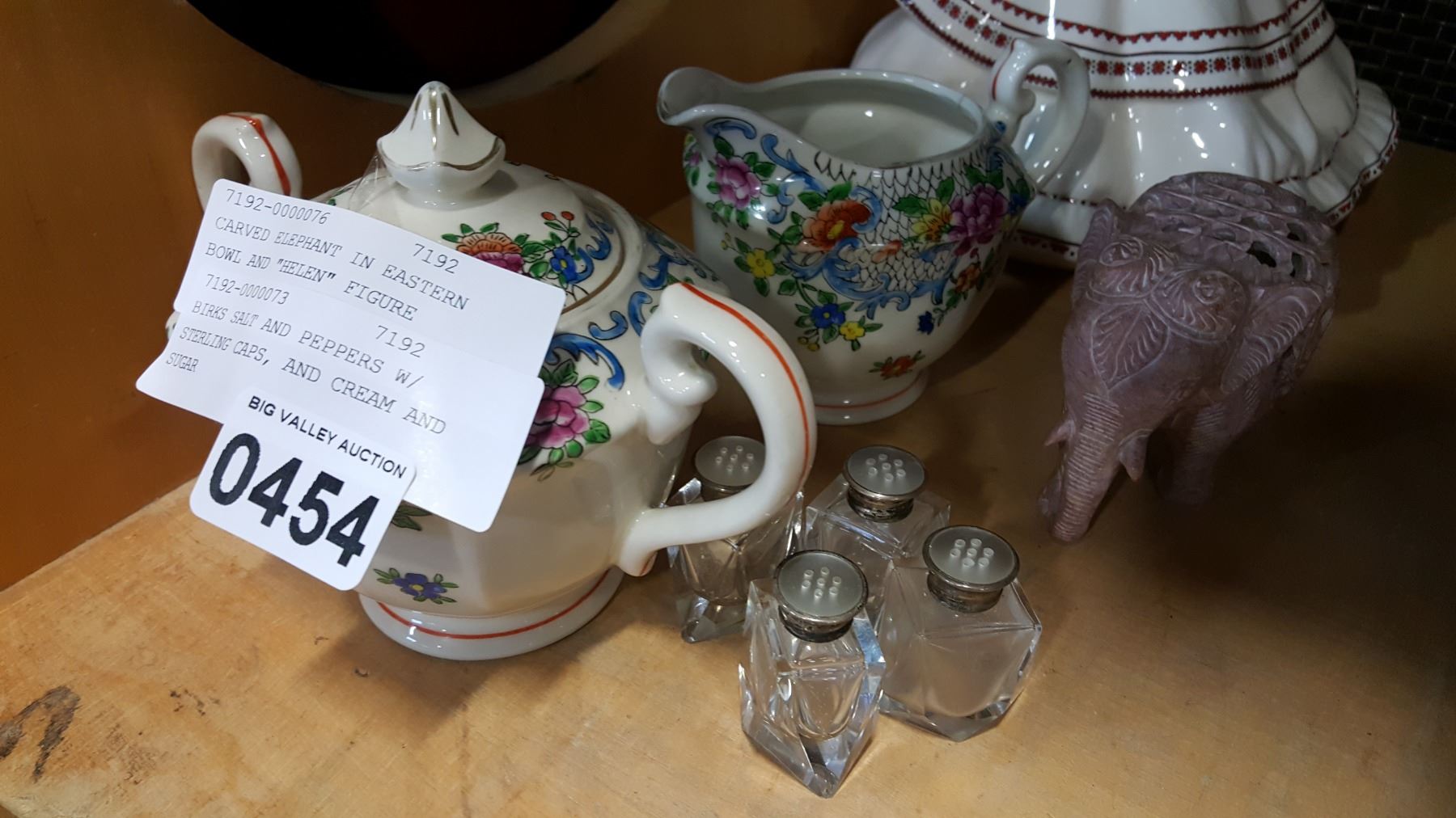 BIRKS STERLING CAP SALT AND PEPPERS, CARVED ELEPHANT IN ELEPHANT, EASTERN BOWL AND "HELEN" FIGURE AND CREAM AND SUGAR