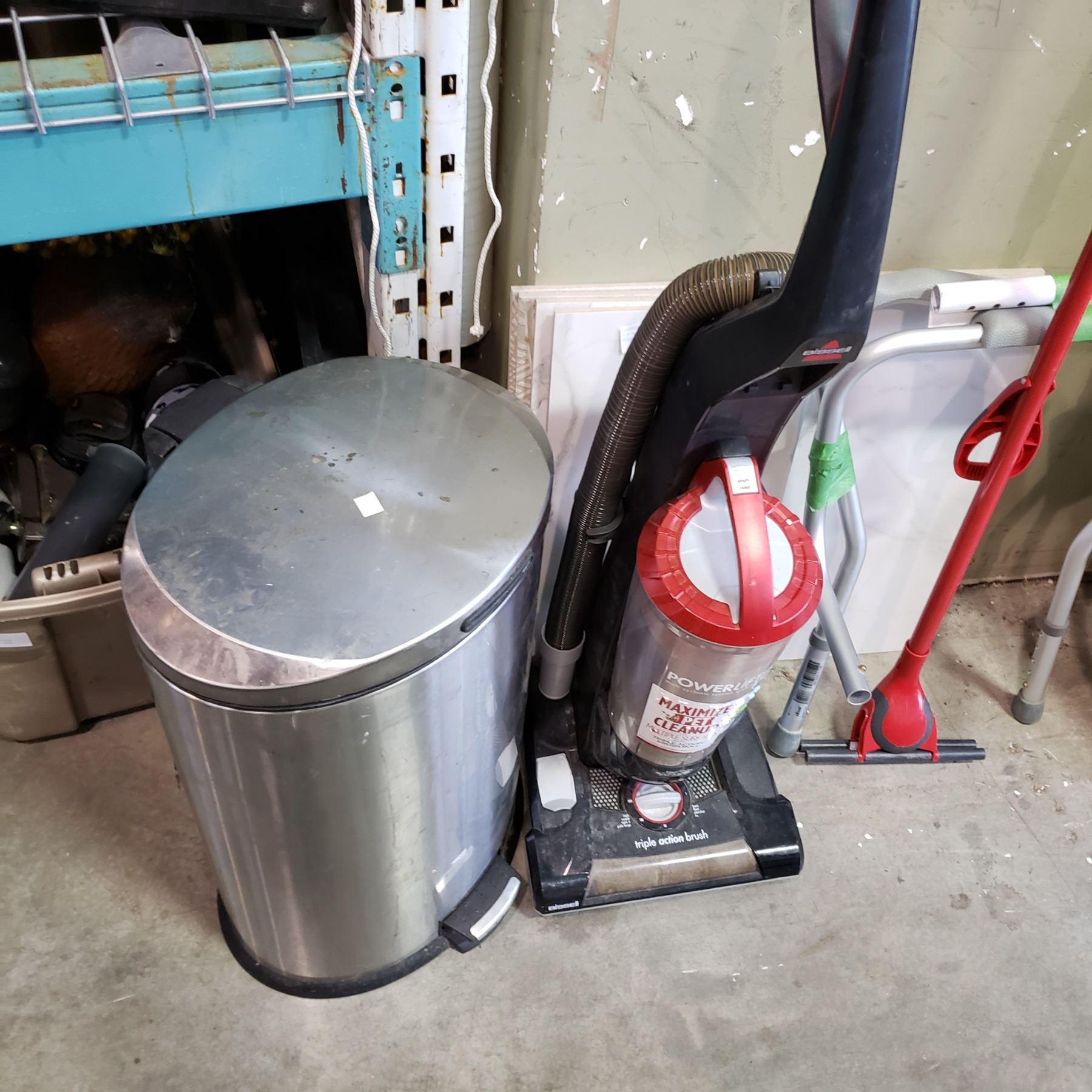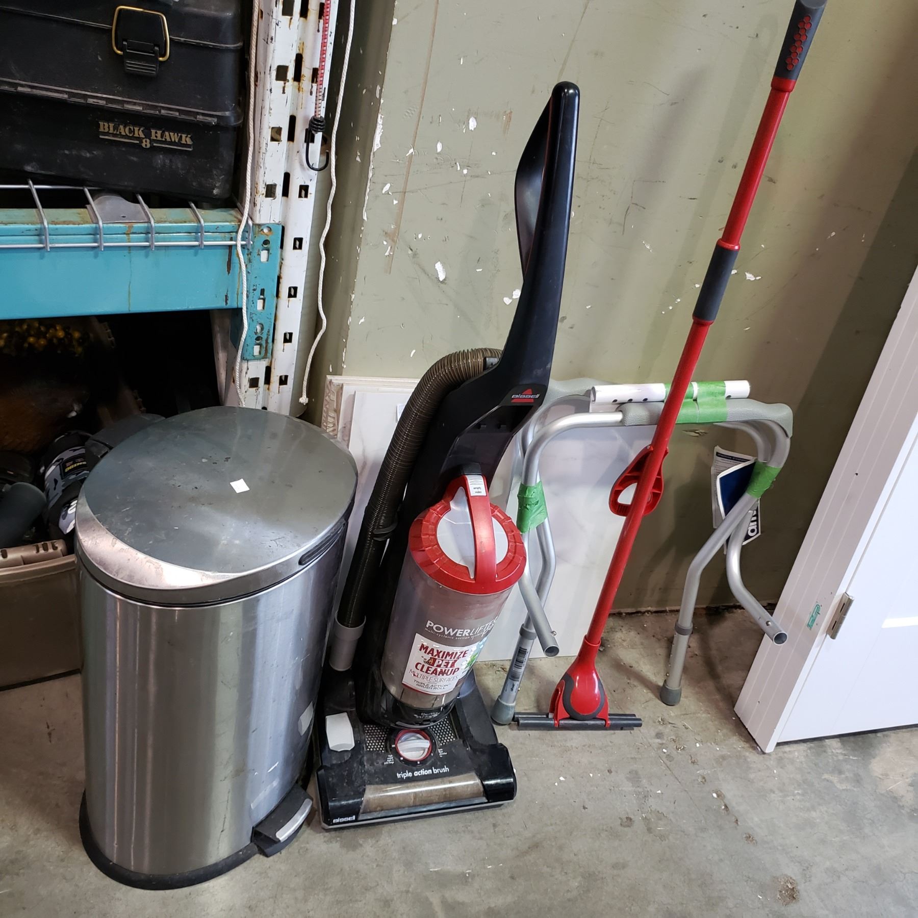 BISSELL VACUUM, STICK MOP, AND TOILET SFETY FRAME W/ STAINLESS GARBAGE