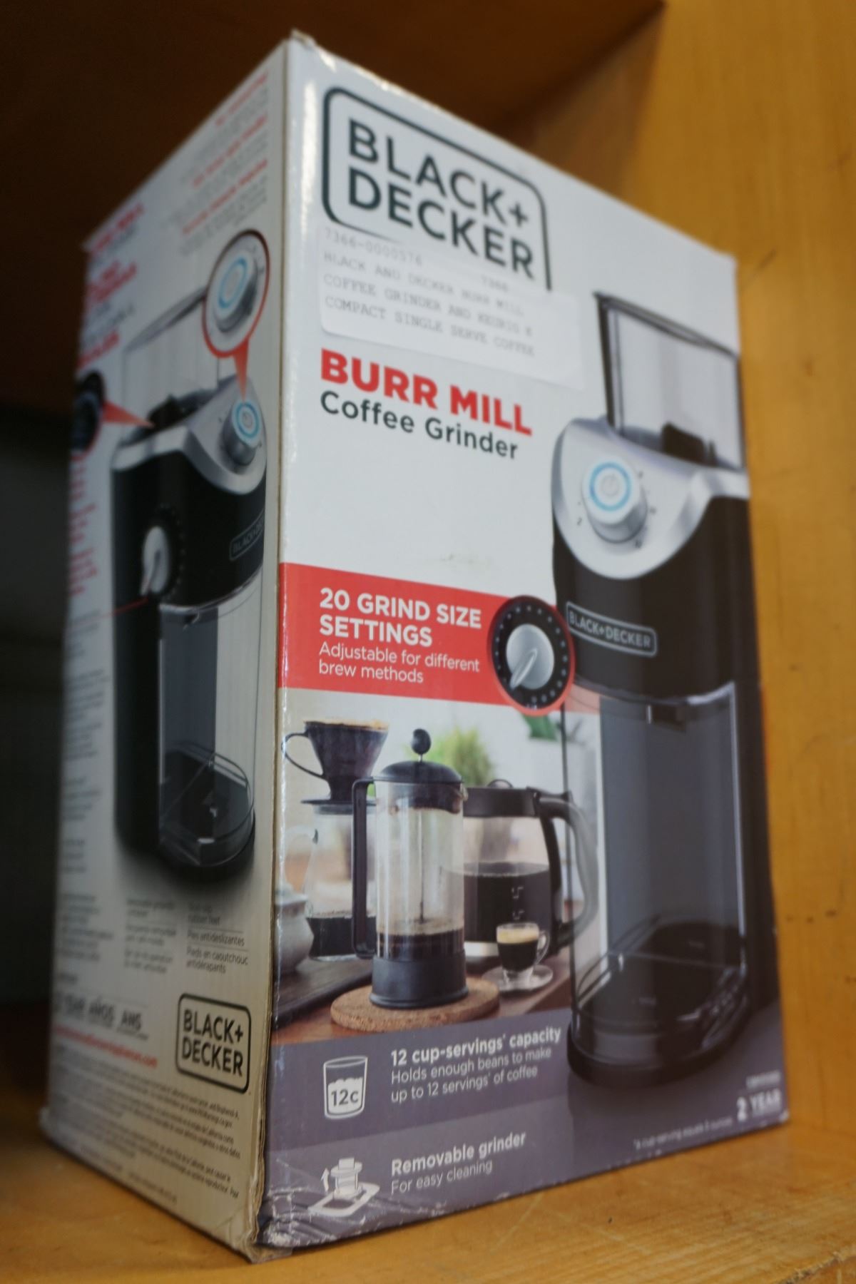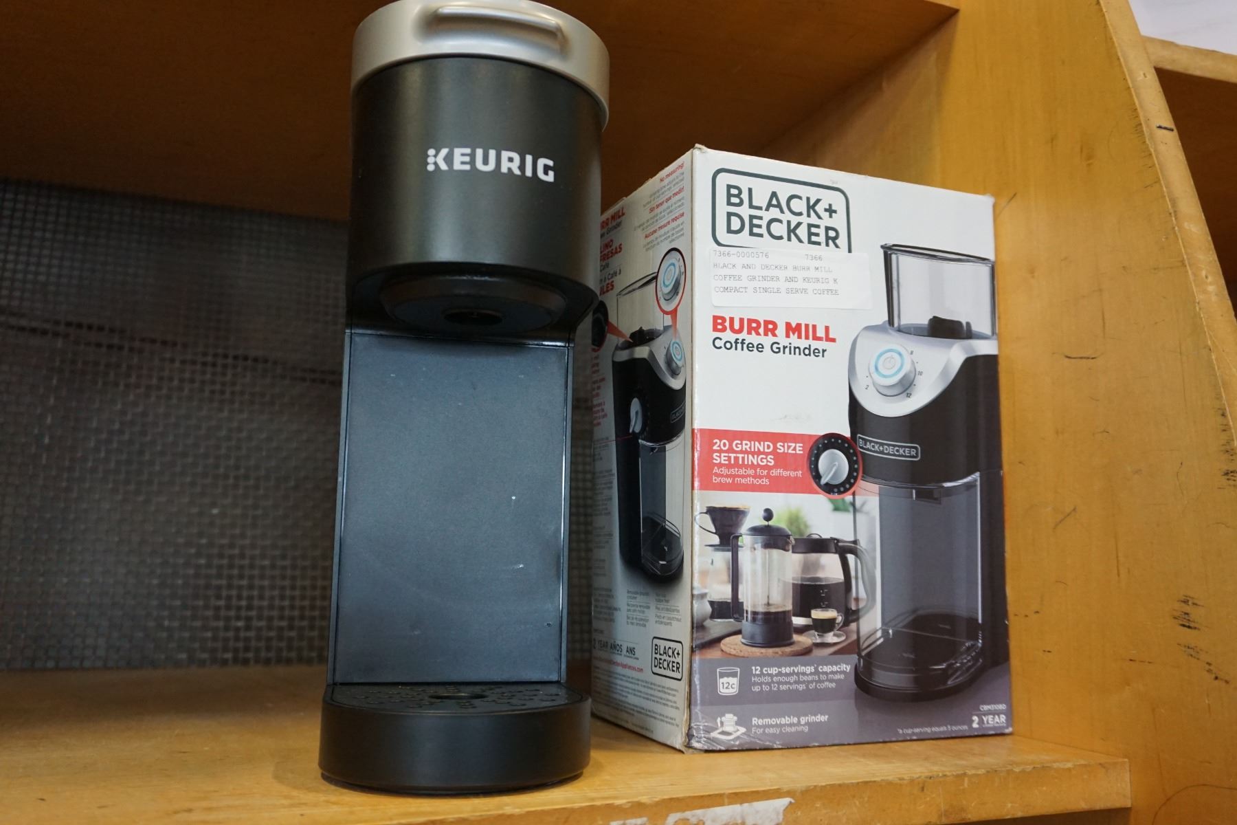 BLACK AND DECKER BURR MILL COFFEE GRINDER AND KEURIG K COMPACT SINGLE SERVE COFFEE MAKER - WORKING IN BOX