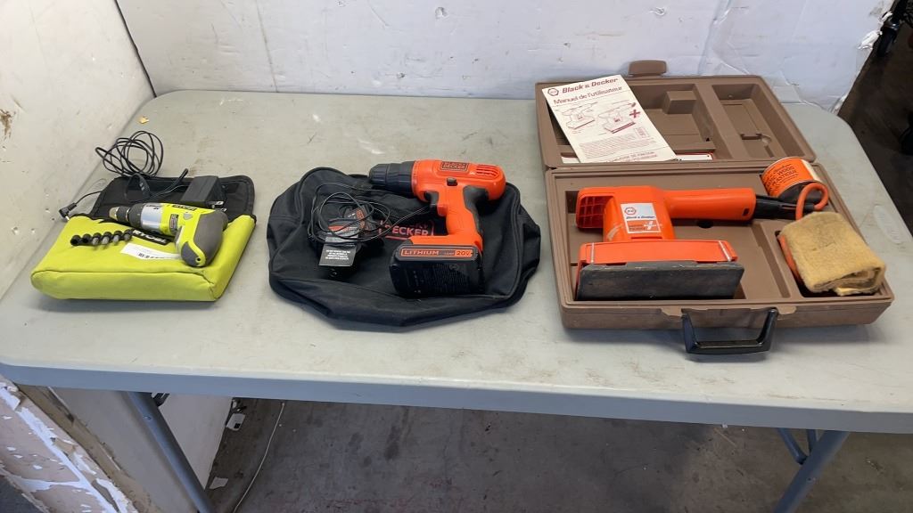 BLACK AND DECKER CORDLESS DRILL, ELECTRIC SANDER RYOBI CORDLESS SCREWDRIVER