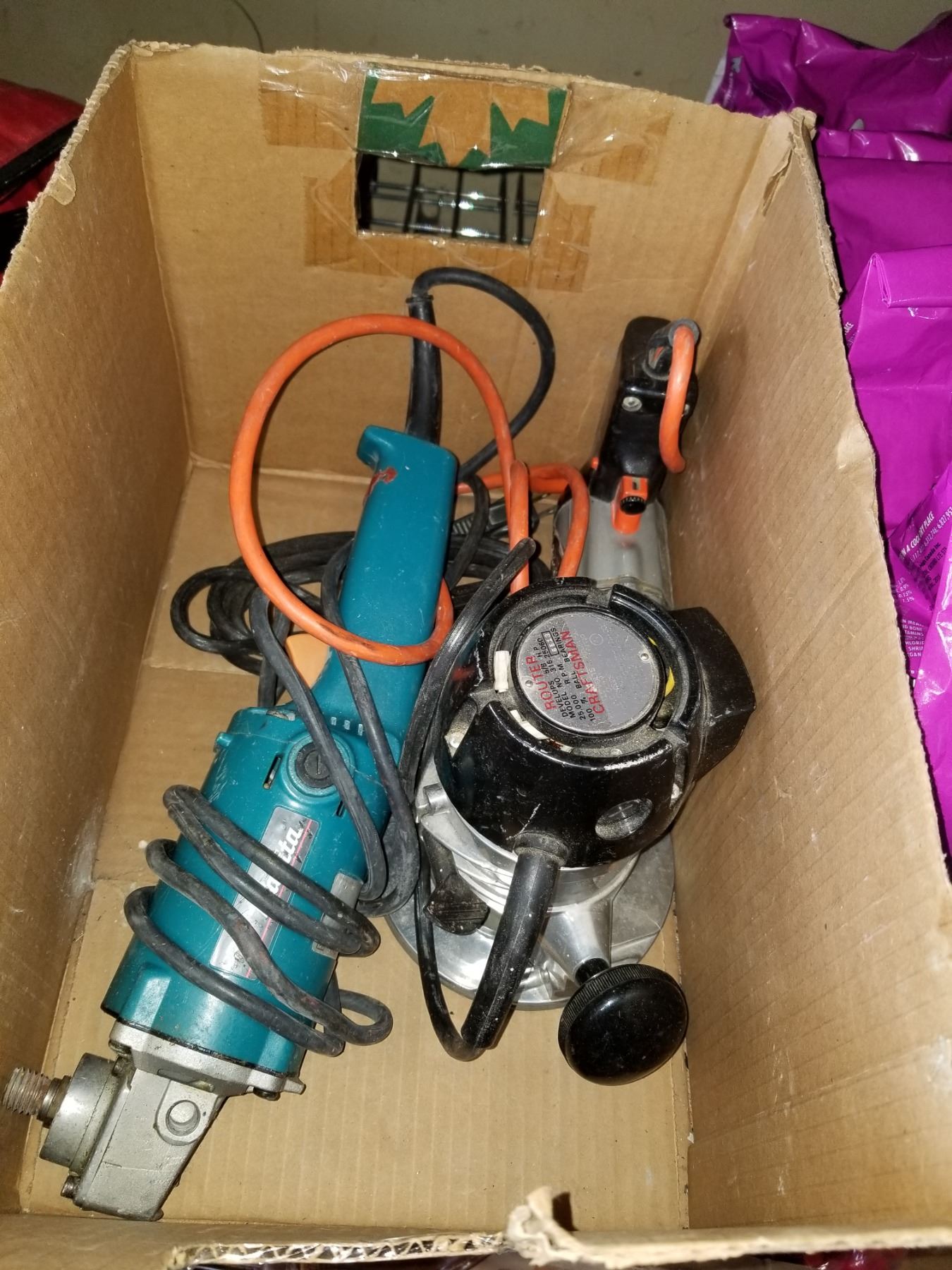 BLACK AND DECKER ELECTRIC GRASS TRIMMER AND ROUTER, DRILL, AND MAKITA ANGLE GRINDER