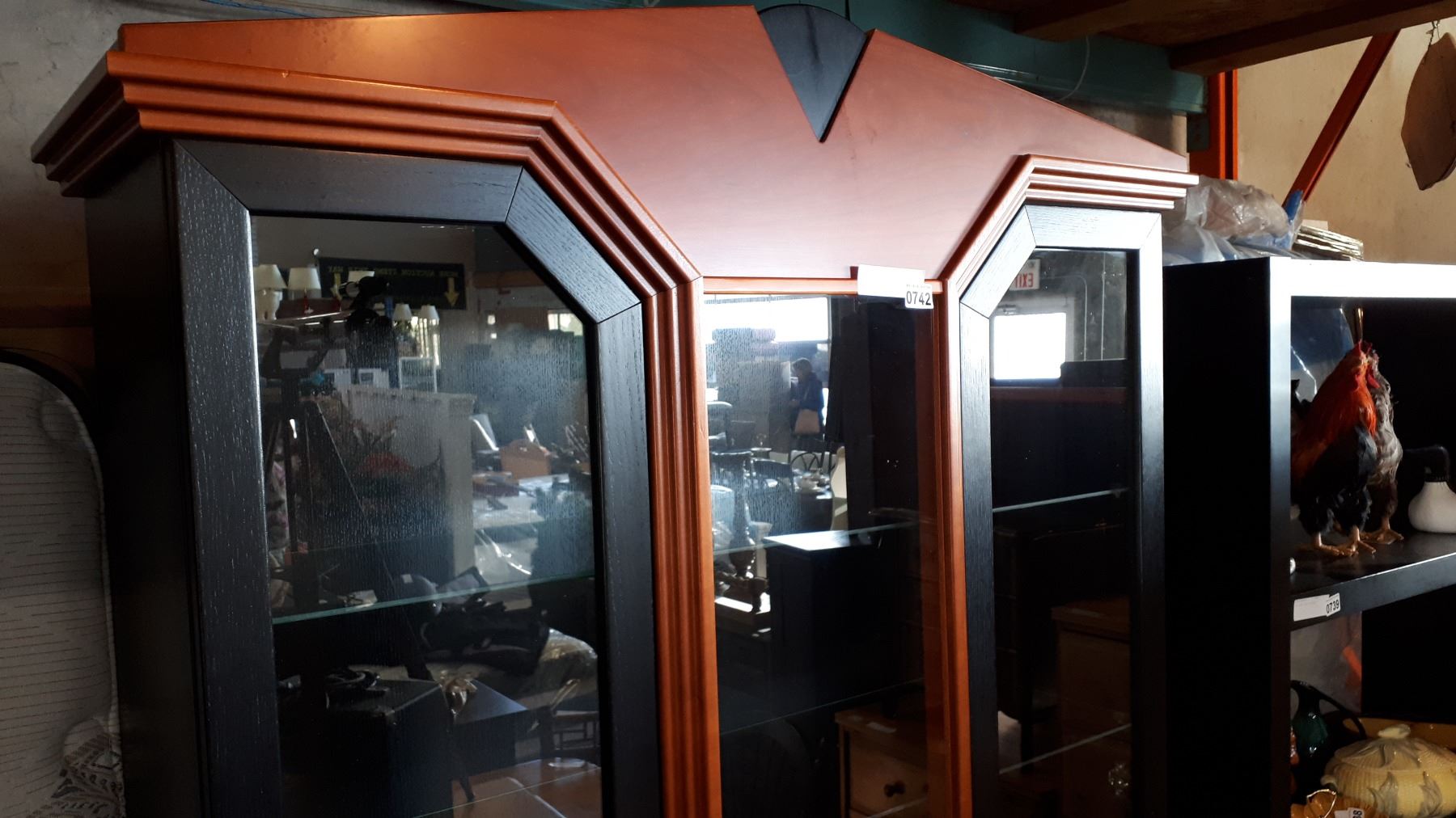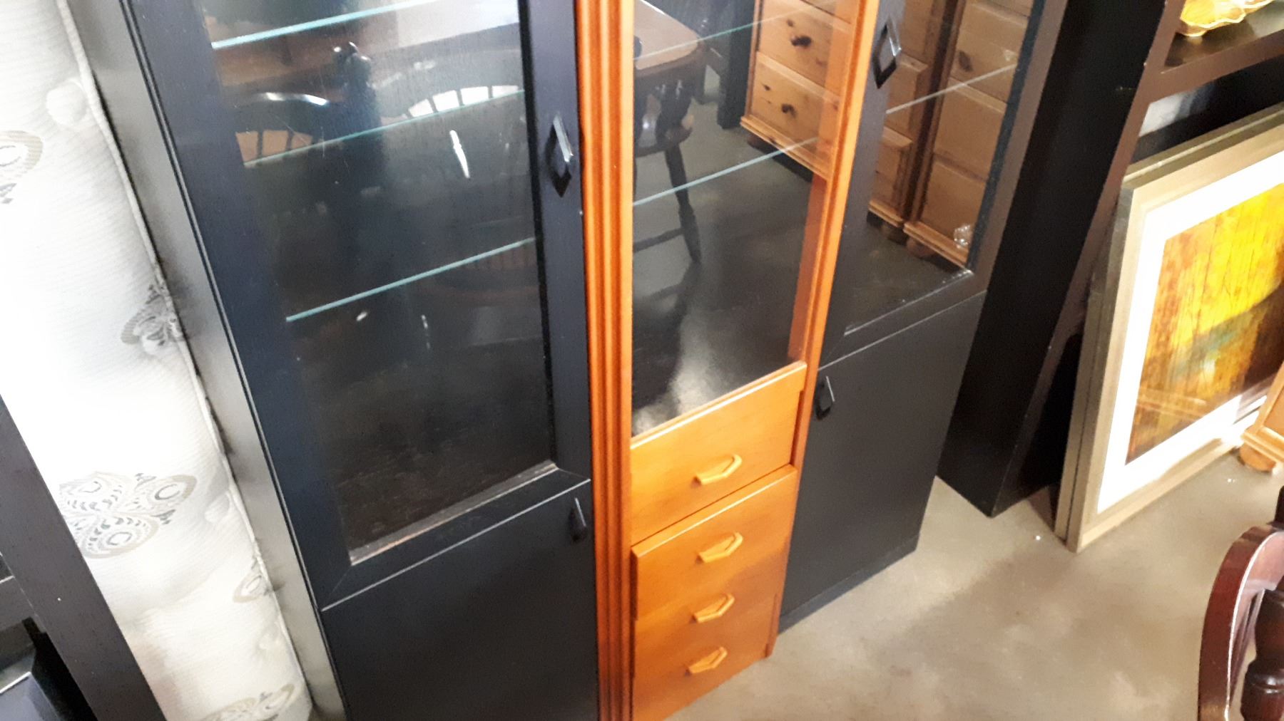 BLACK AND MAPLE GLASS DOOR DISPLAY CABINET