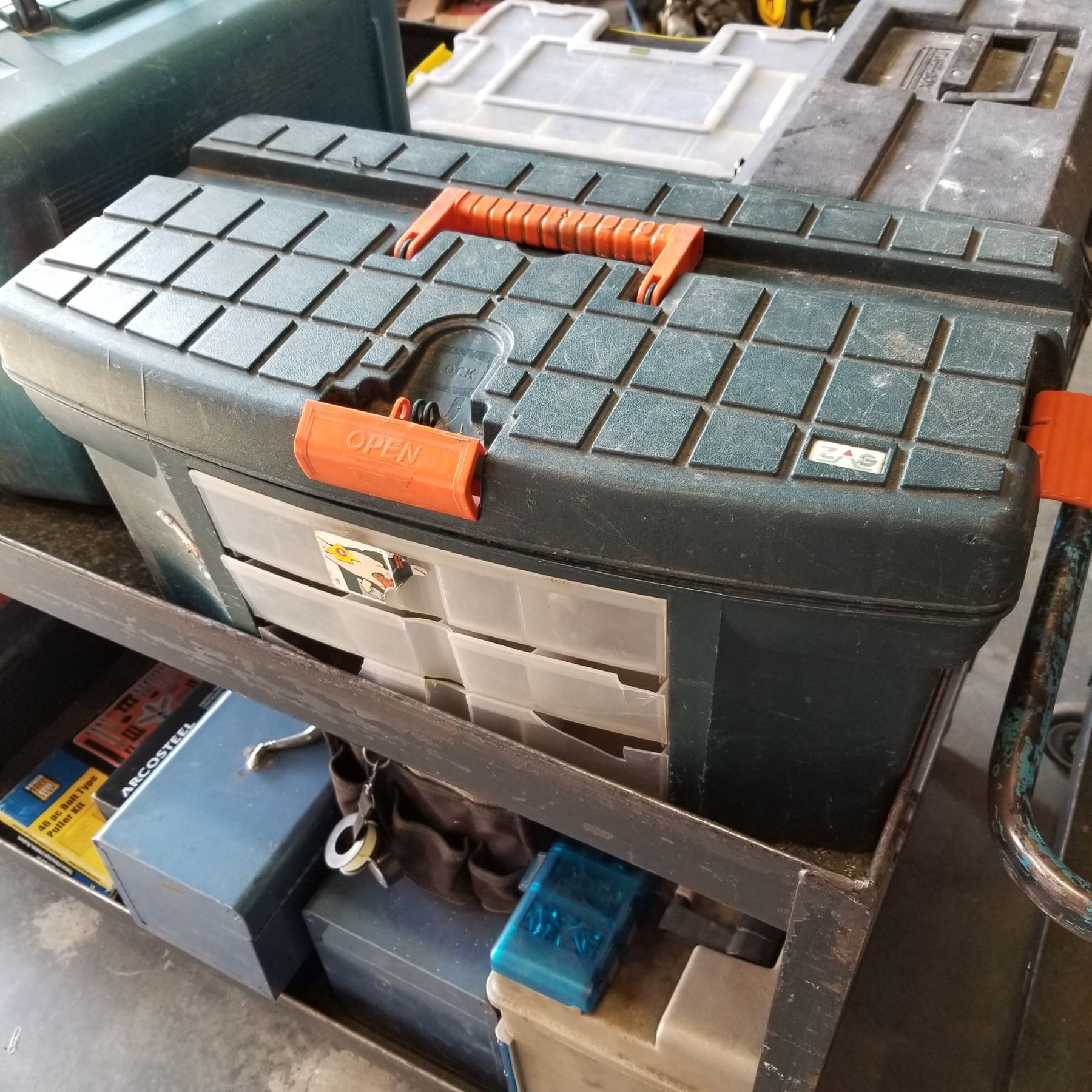 BLACK AND ORANGE TOOLBOX W/ CONTENTS
