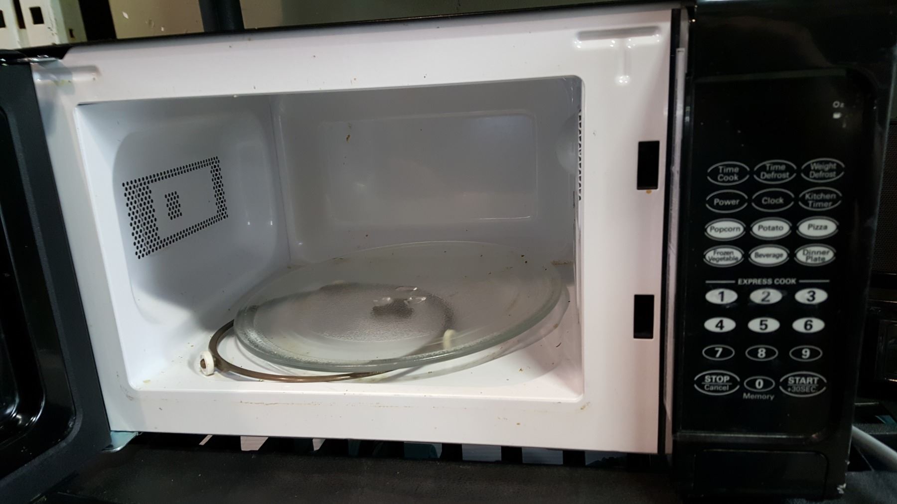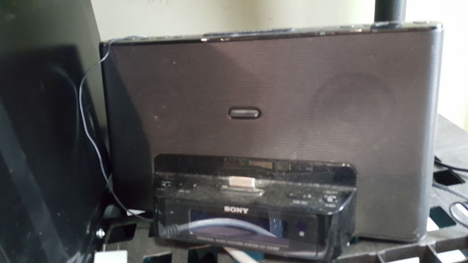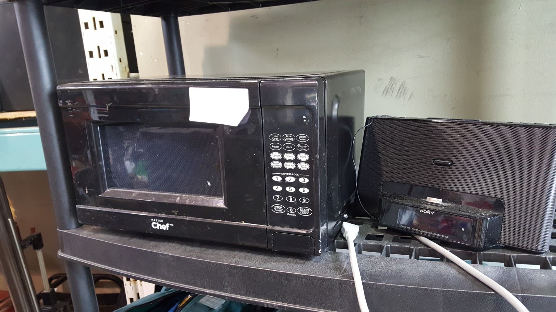 BLACK APPARTMENT SIZE MASTER CHEF MICROWAVE AND SONY IPOD DOCK