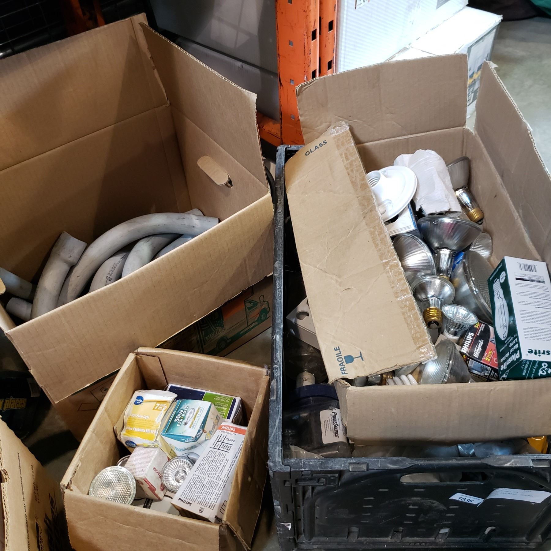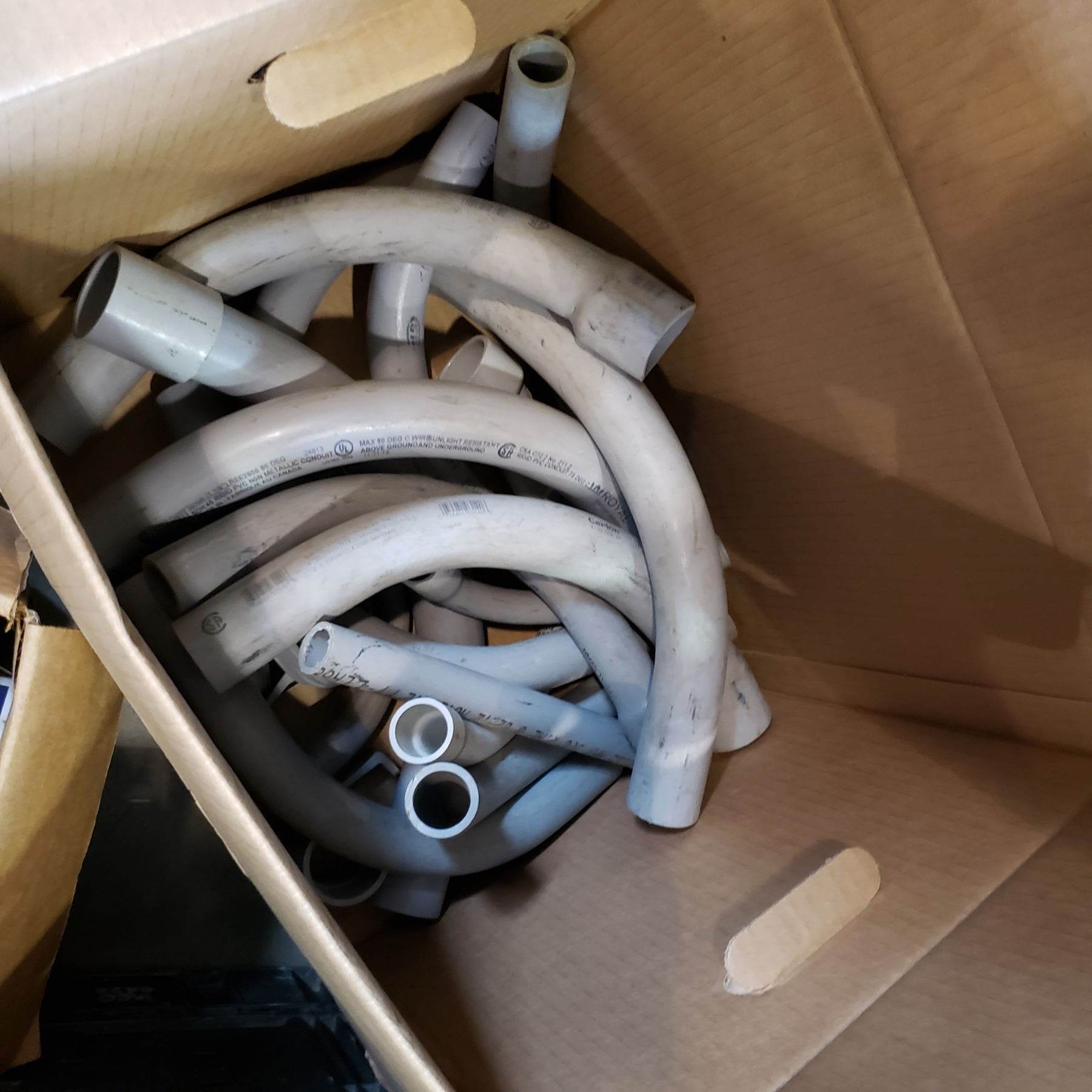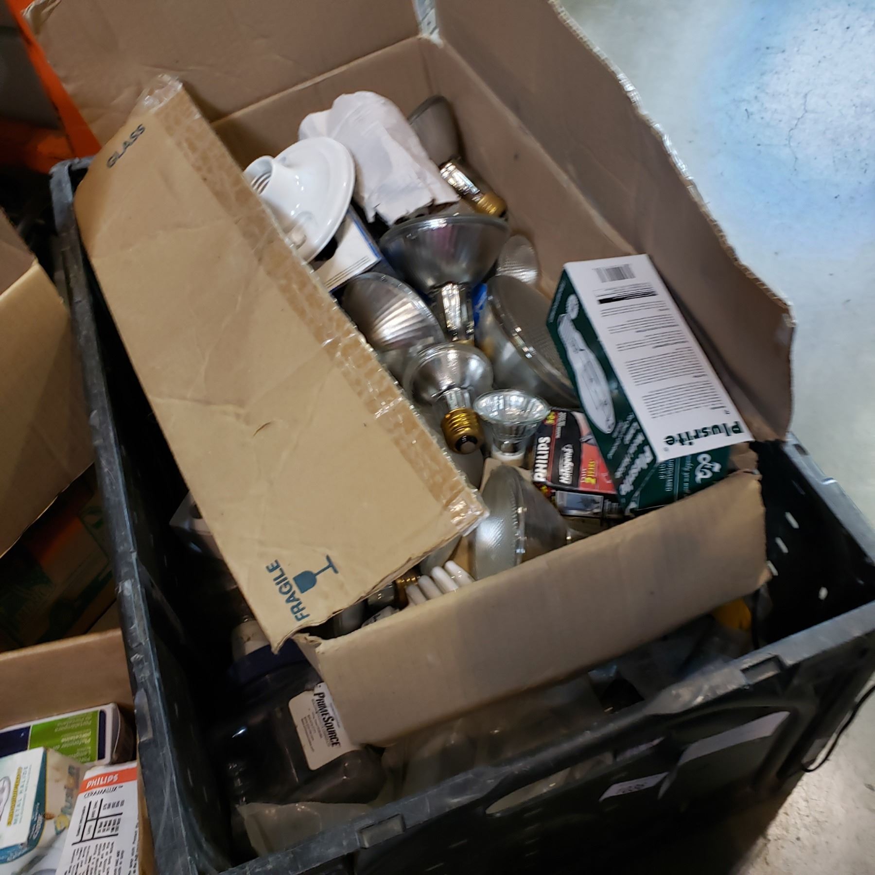 BLACK CRATE AND BOX OF ELECTRICAL HARDWARE, ELBOWS, LIGHT BULBS