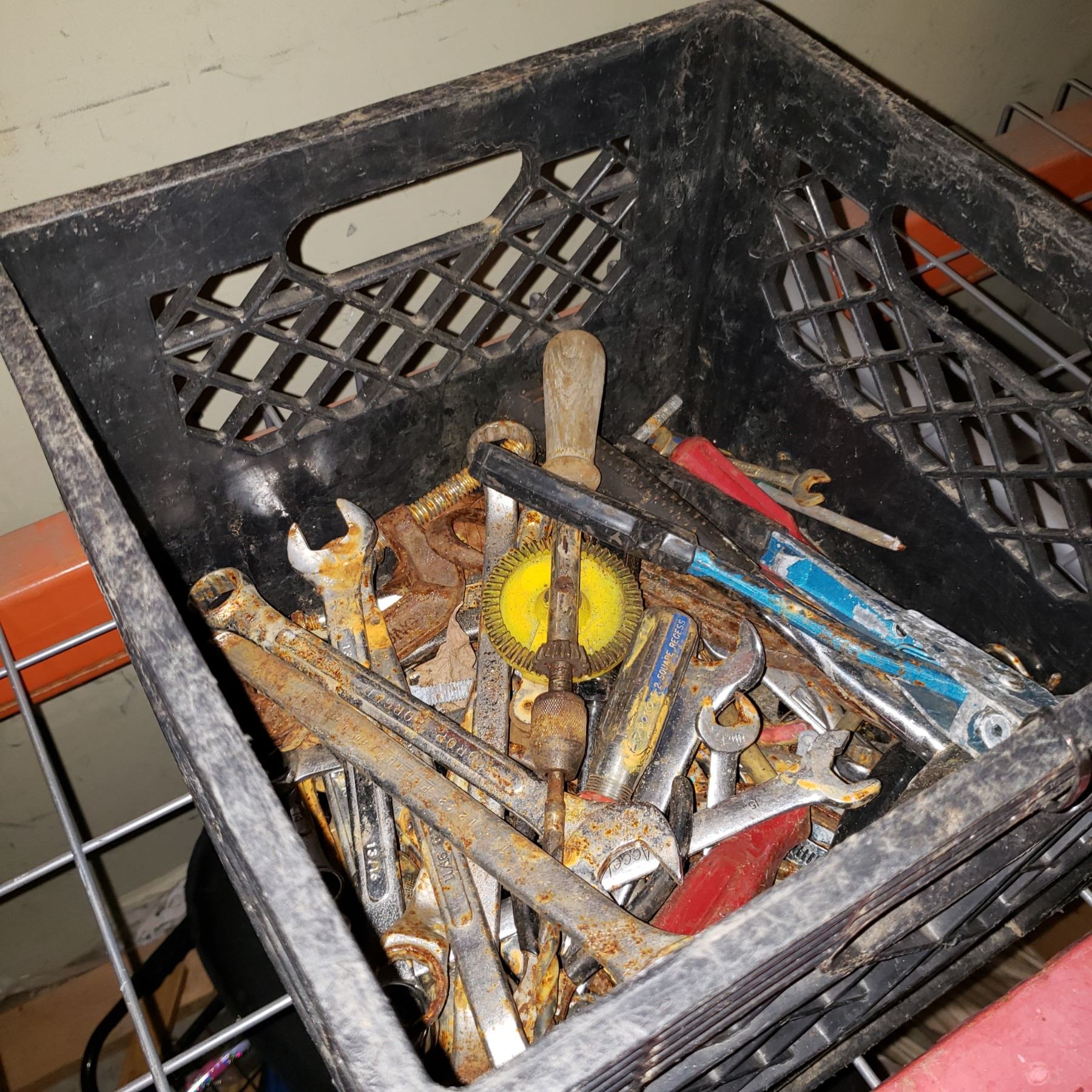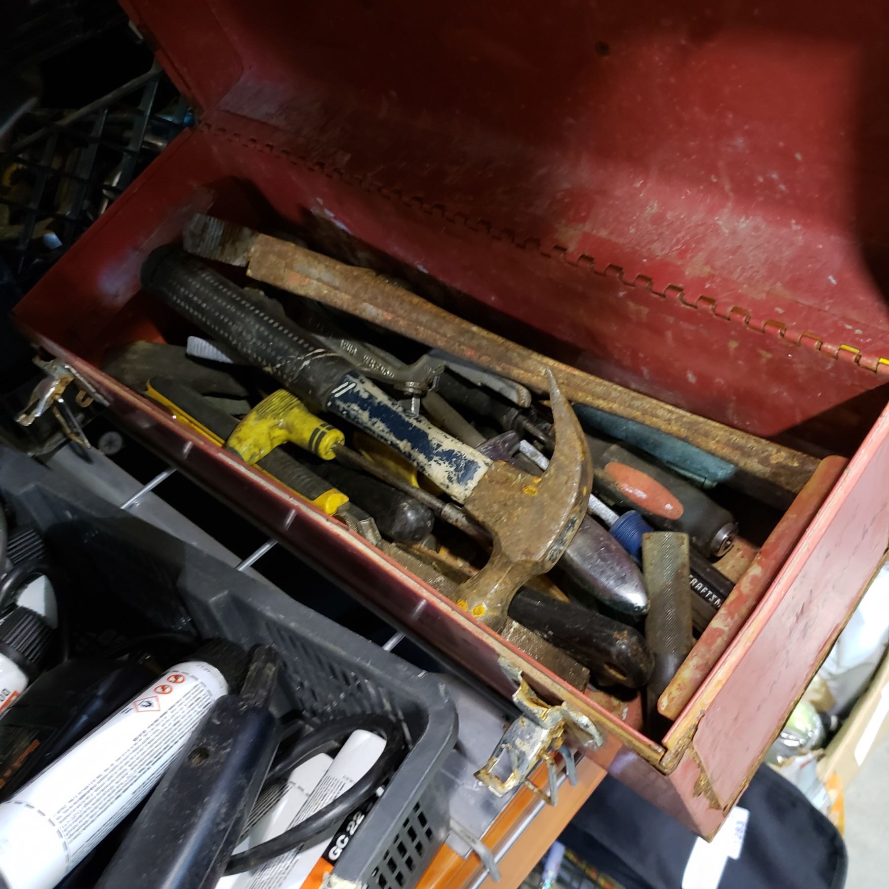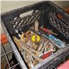 BLACK CRATE AND RED TOOL BOX OF TOOLS