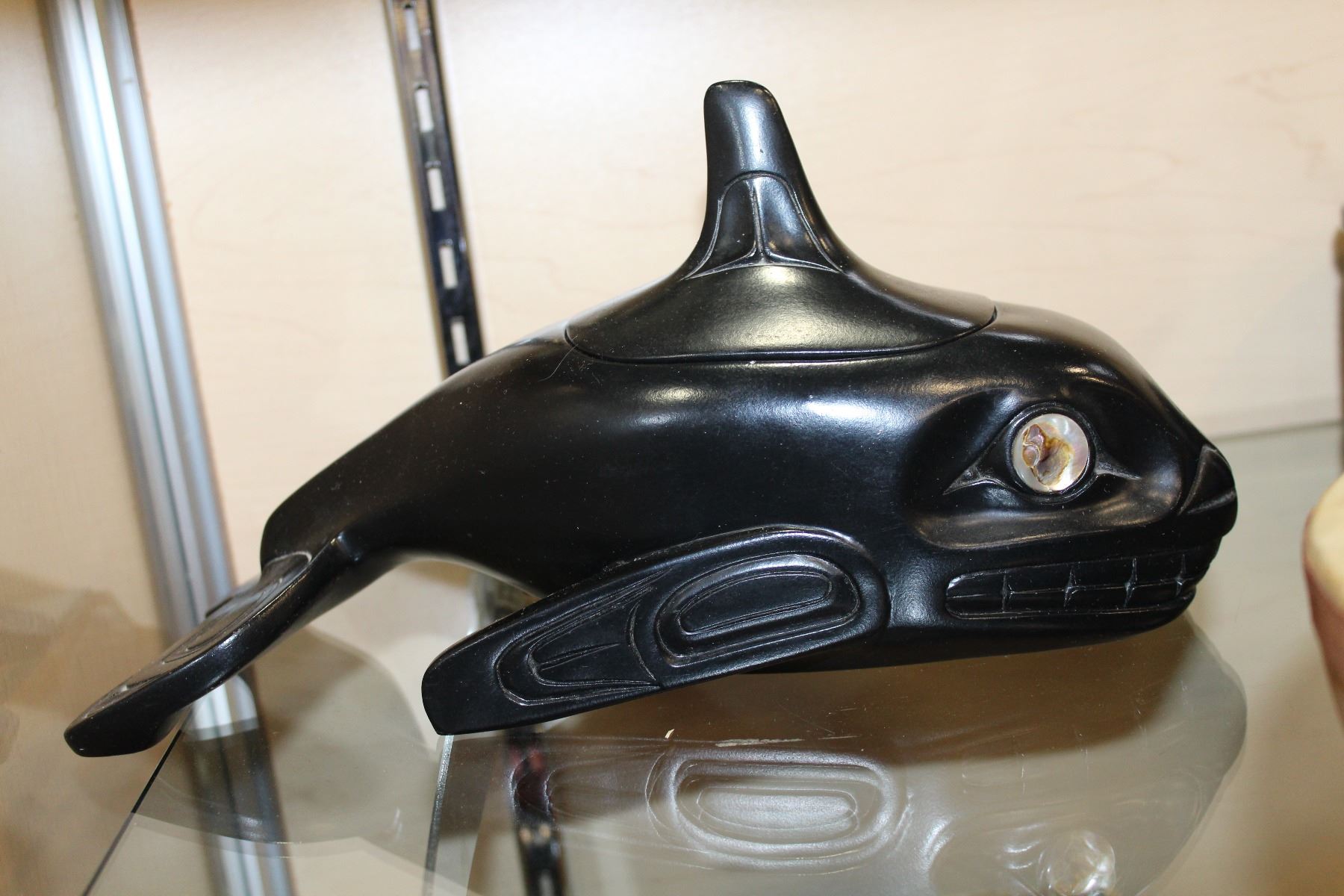 BLACK FIRST NATIONS LIDDED BOX AND DRUM AND WHALE DISH ROUND DISH TRAY AND BEADS