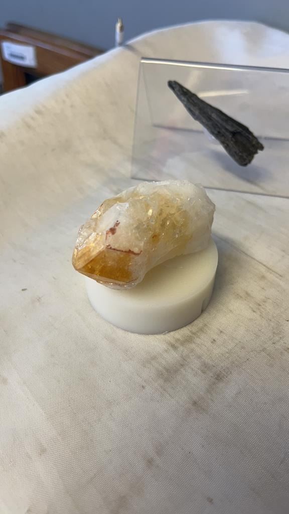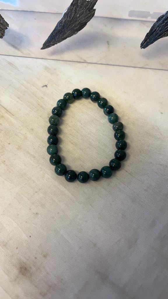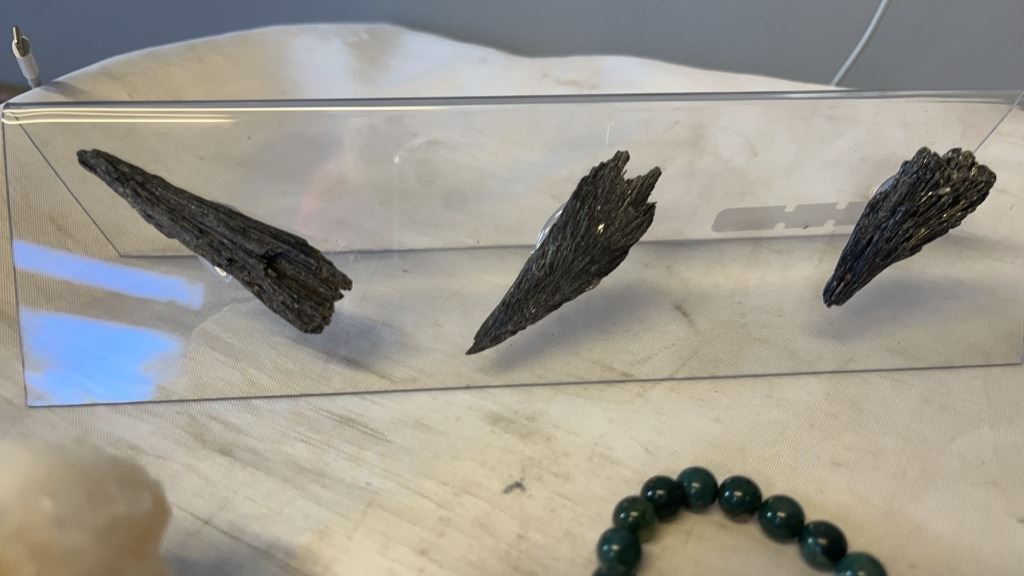 BLACK KYNITE DISPLAY W/ CITRINE ROUGH POINT AND MOSS AGATE BRACELET
