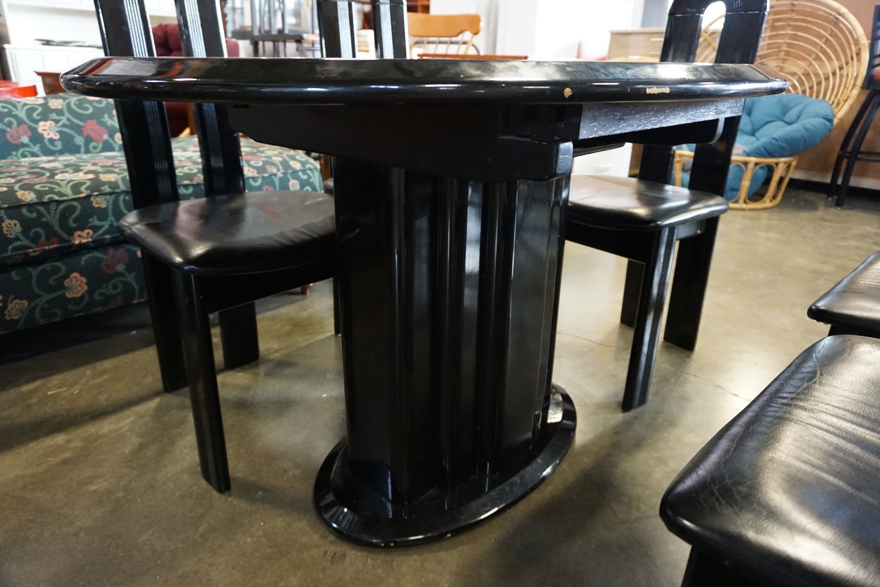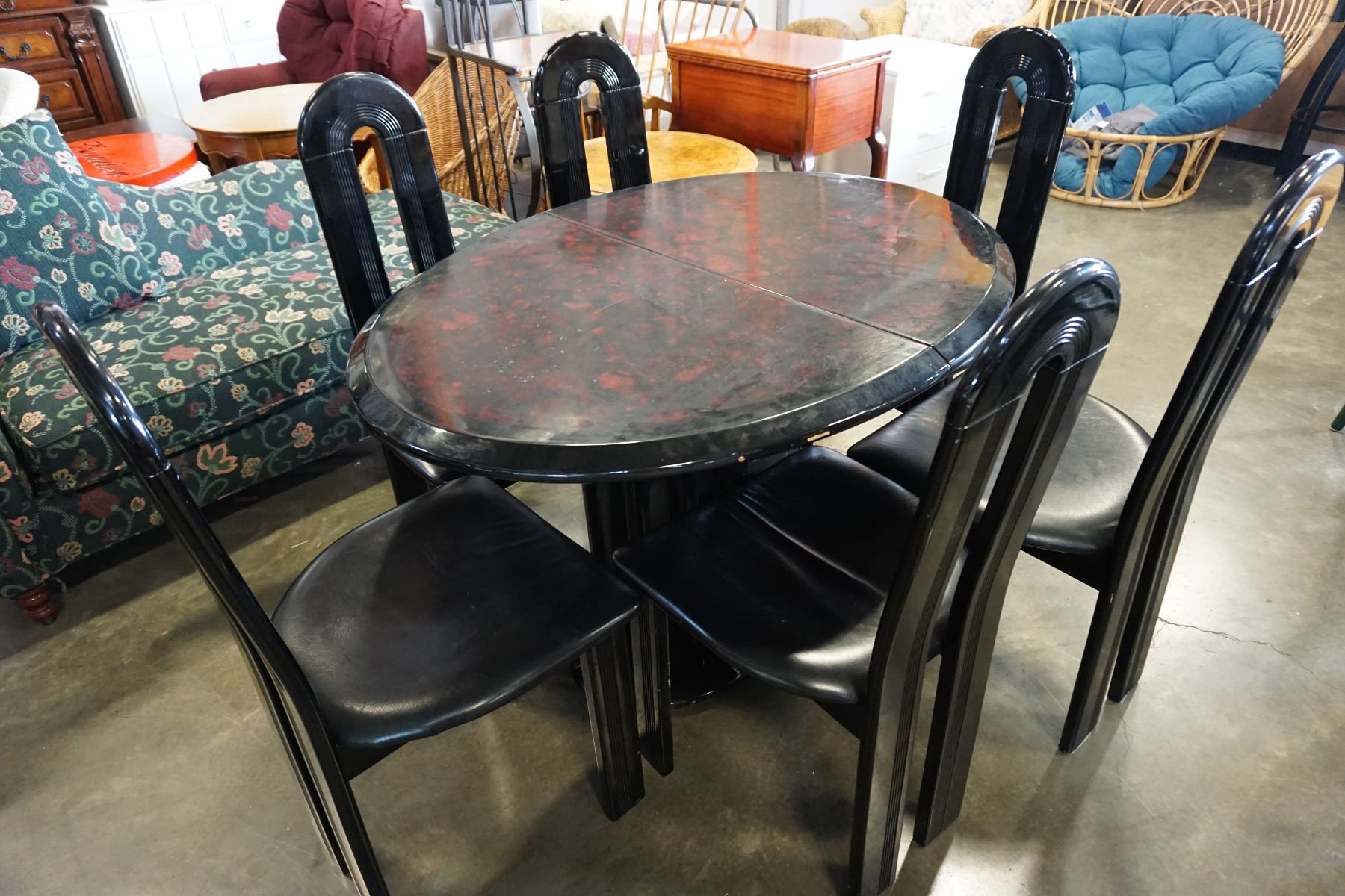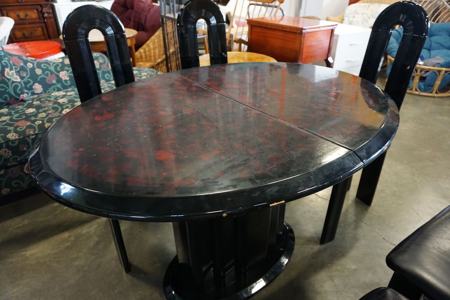 BLACK LAQUER DINING TABLE W/ 6 CHAIRS AND JACK KNIFE LEAF