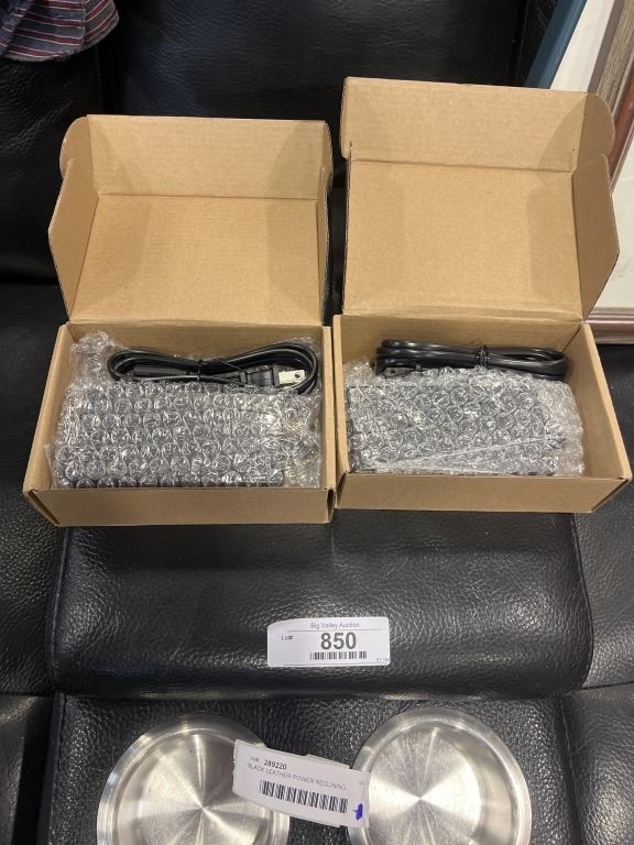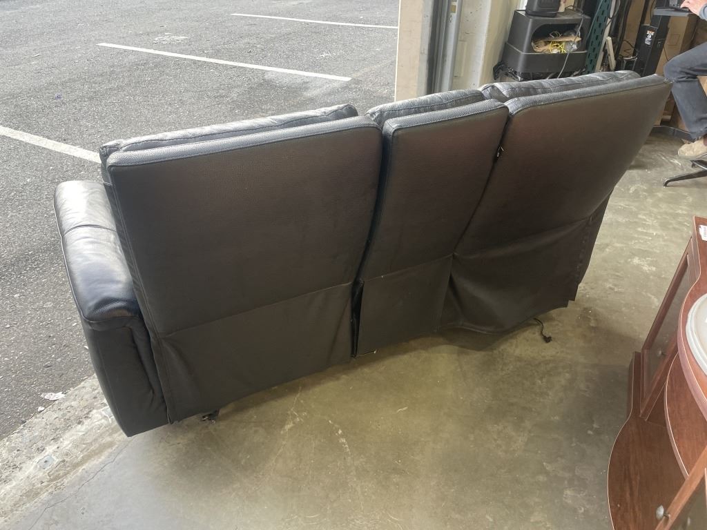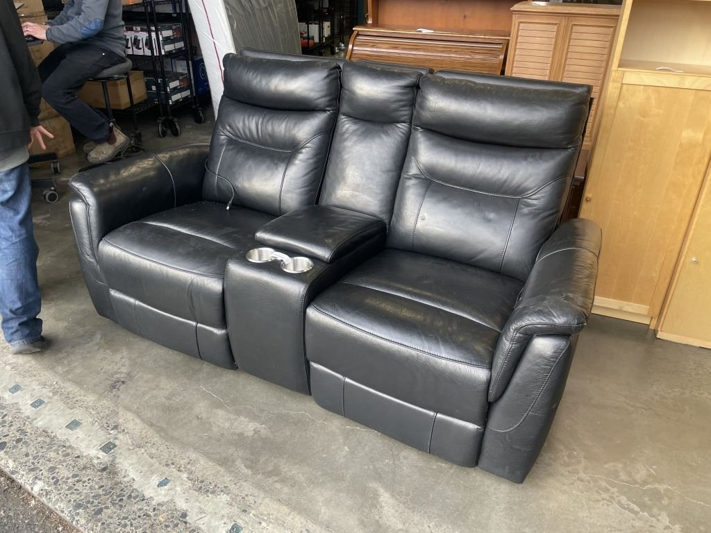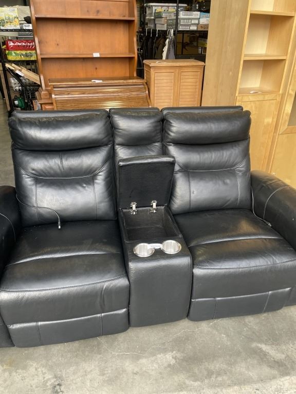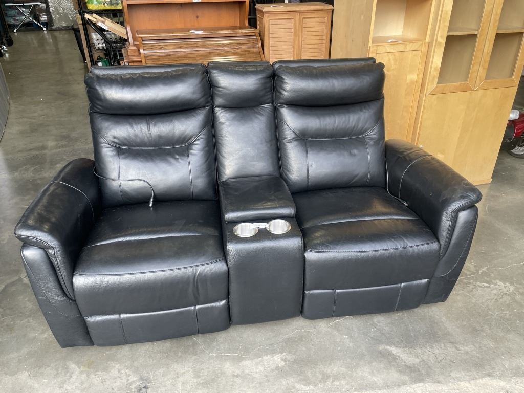 BLACK LEATHER POWER RECLINING LOVESEAT WITH CONSOLE, WORKING IN GOOD CONDITION
