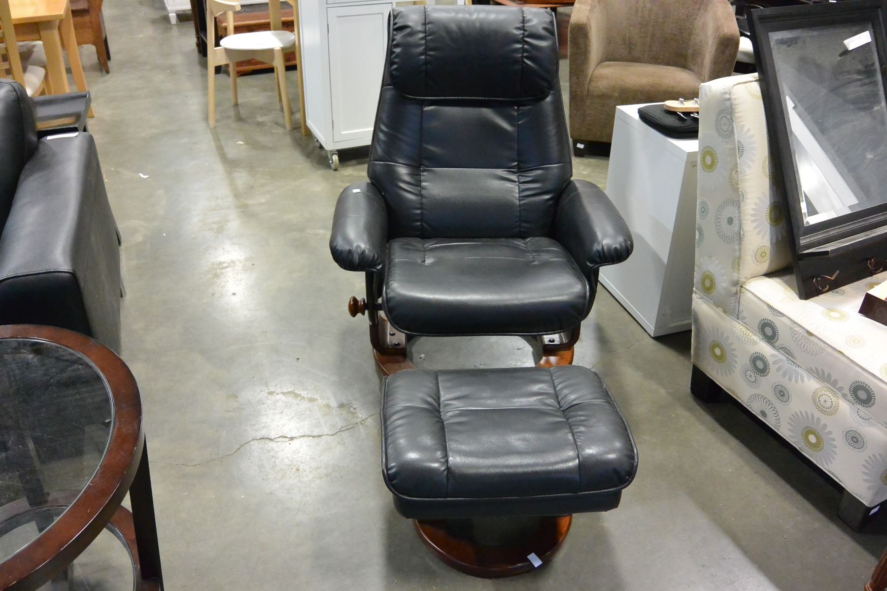 BLACK LEATHER RECLINER AND FOOTSTOOL