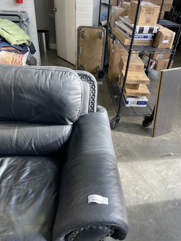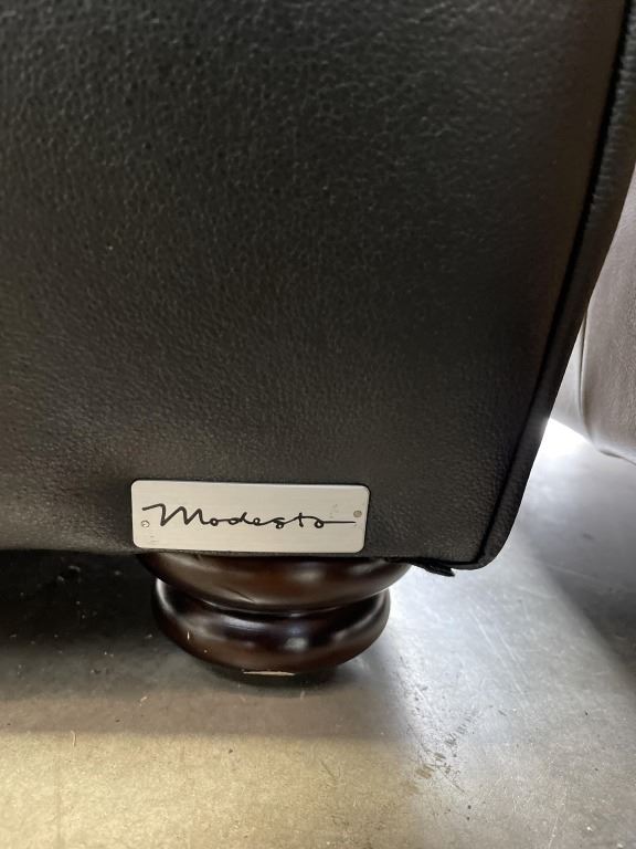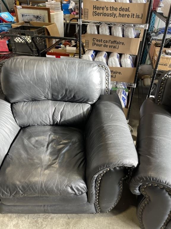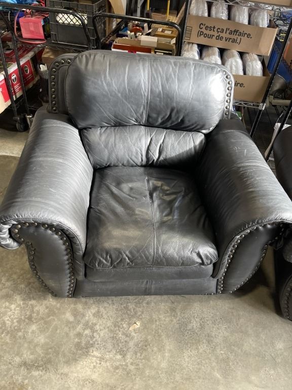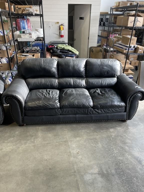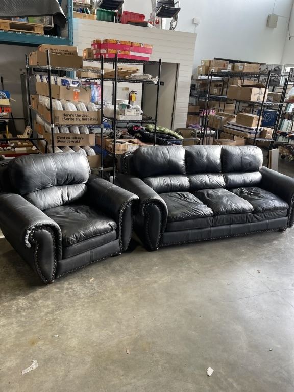 BLACK LEATHER SOFA AND CHAIR WITH BRASS NAIL HEAD