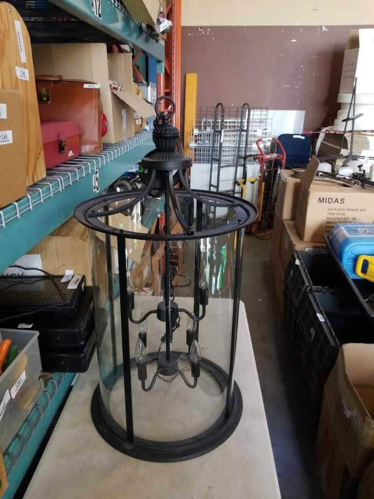 BLACK METAL AND BOWED GLASS CHANDELIER