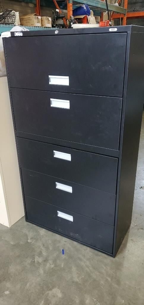 BLACK STAPLES 5 DRAWER LATERAL FILING CABINET - 3 FOOT WIDE X 18 INCHES DEEP X 65 1/2 INCHES TALL