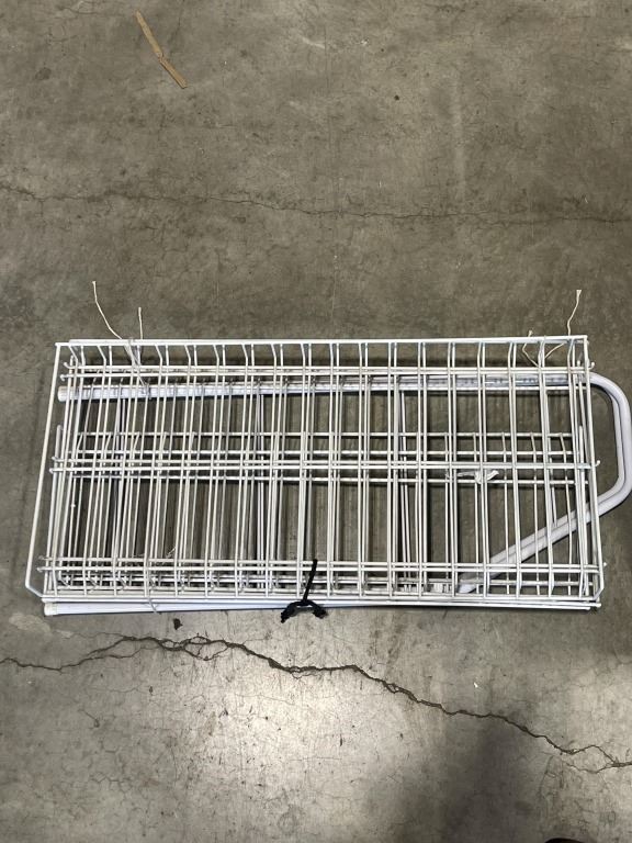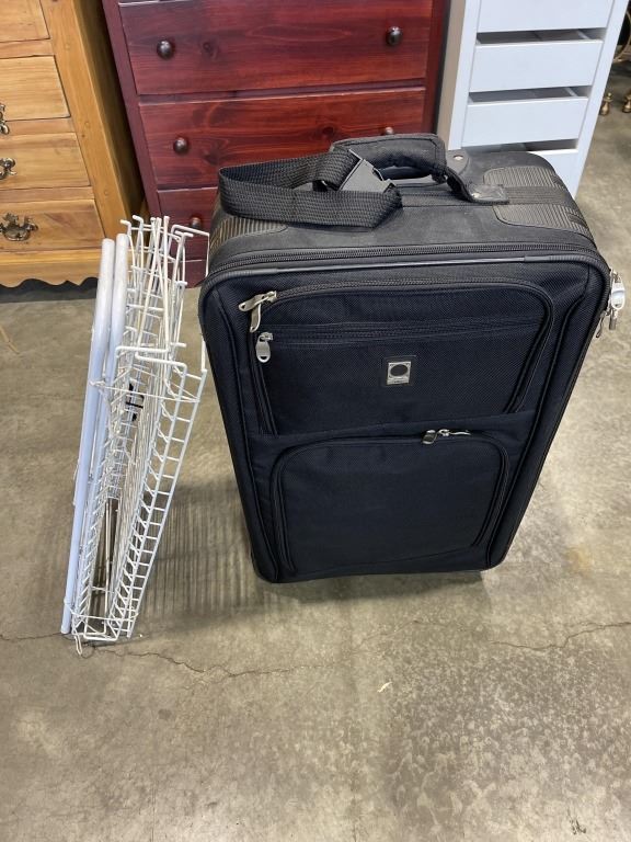 BLACK SUITCASE AND WHITE METAL SHOE RACK