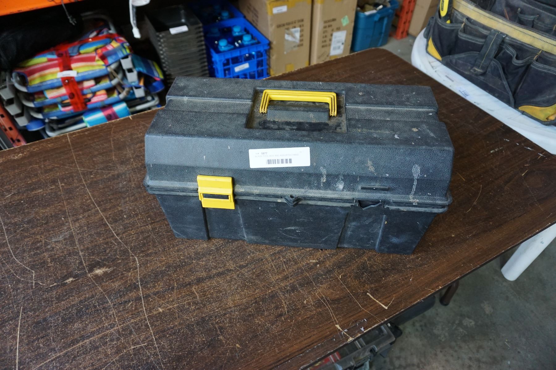 BLACK TOOL BOX AND ASSORTED HAND TOOLS