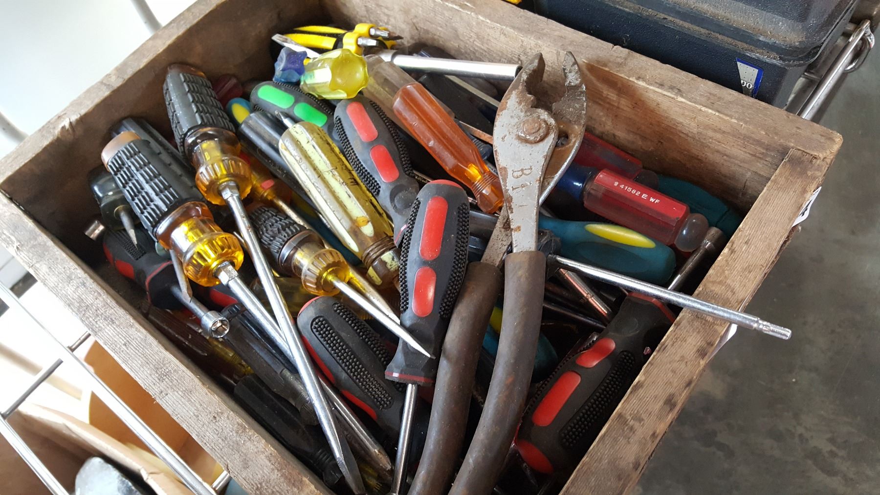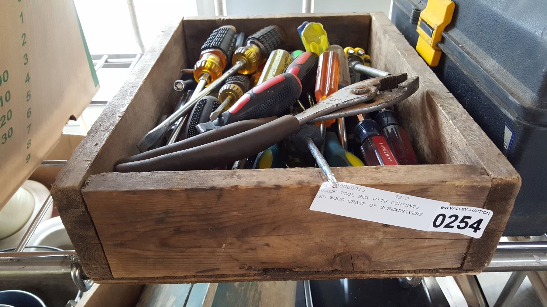 BLACK TOOL BOX WITH CONTENTS AND WOOD CRATE OF SCREWDRIVERS