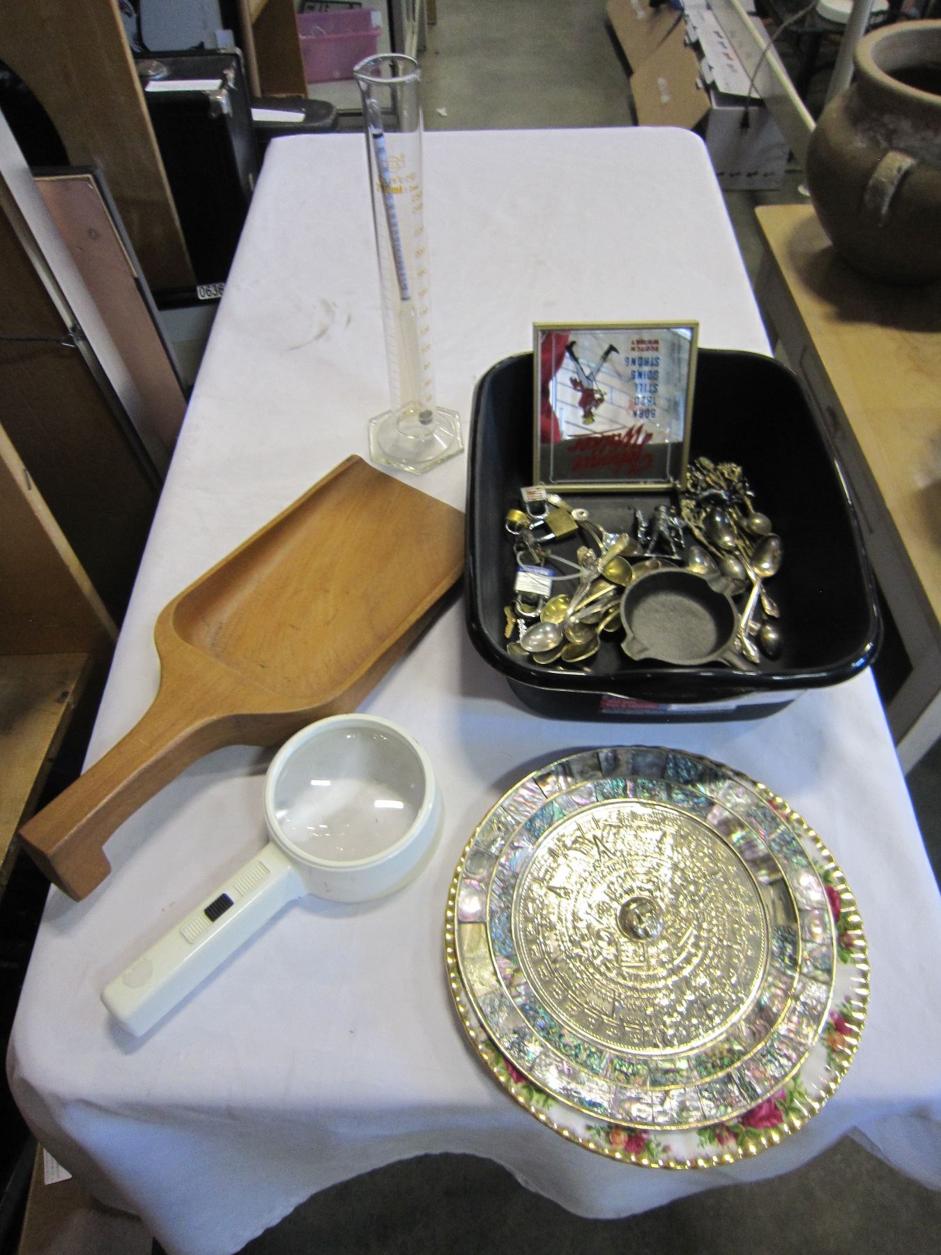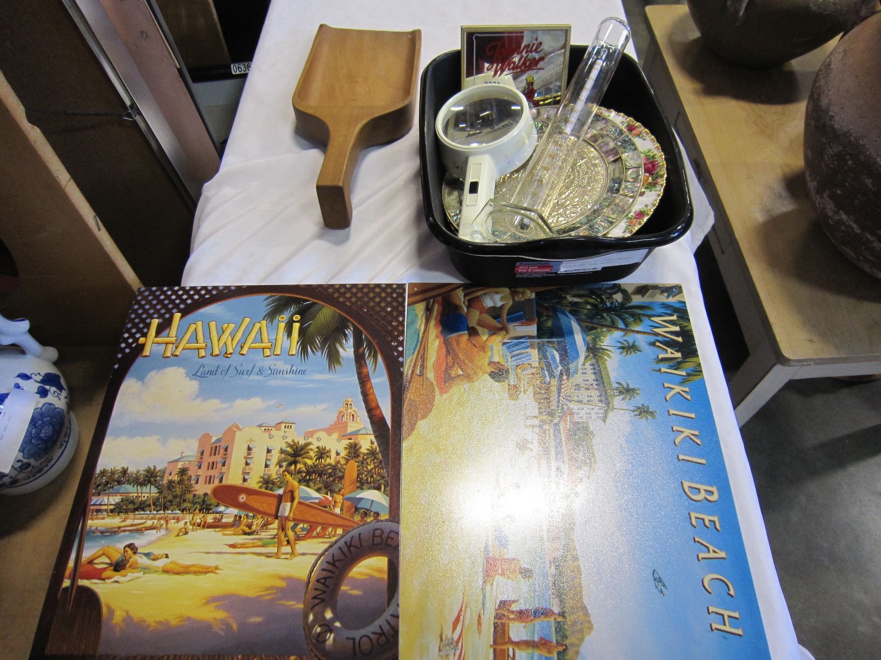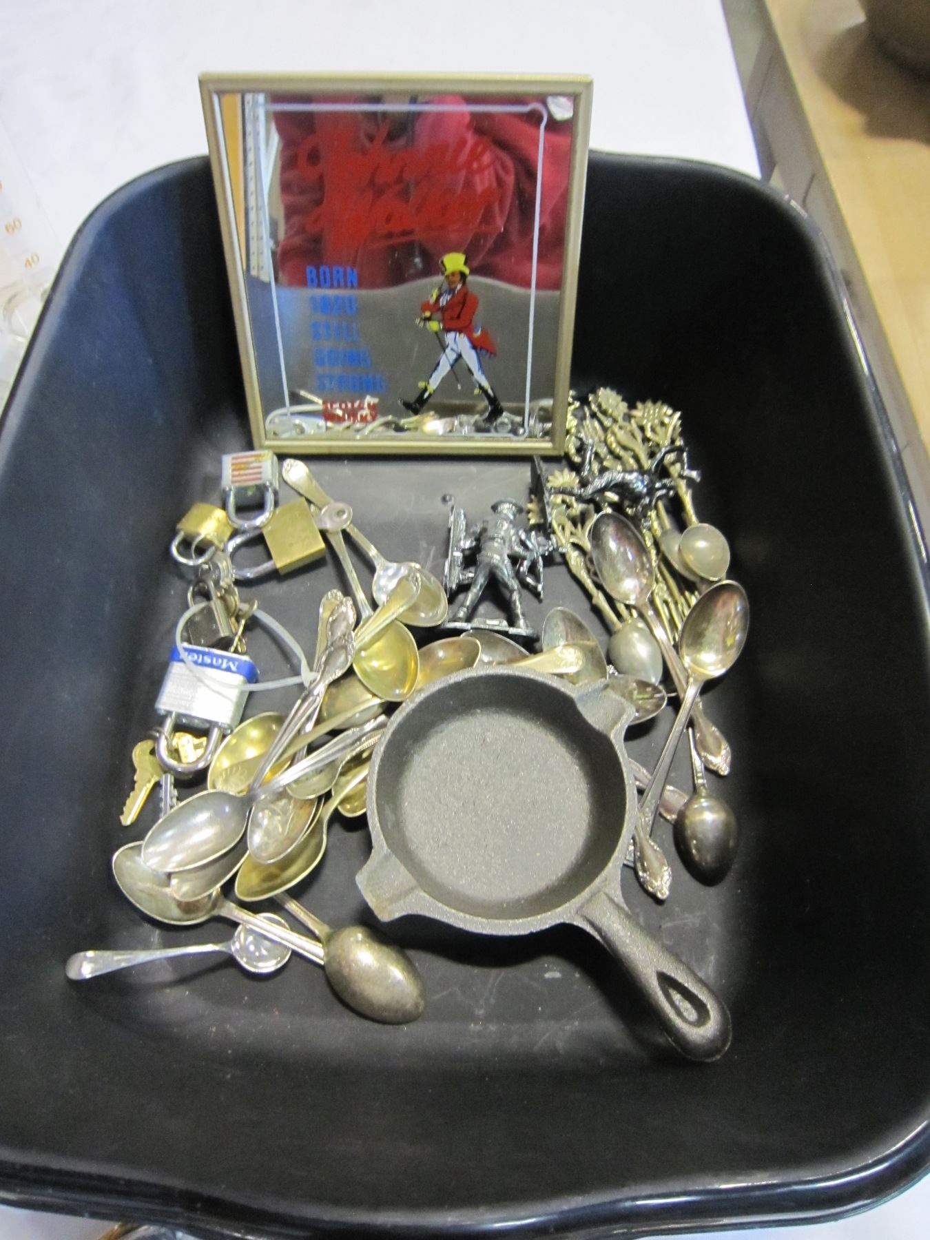 BLACK TOTE OF ESTATE COLLECTIBLES W/ JOHNIE WALKER MIRROR AND TEAK SHOVEL