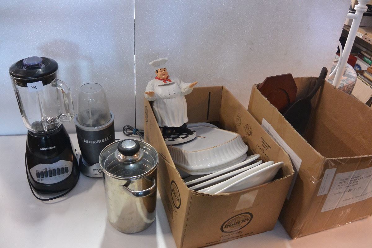 BLENDER,NUTRI-BULLET AND BOX OF BAKEWARE