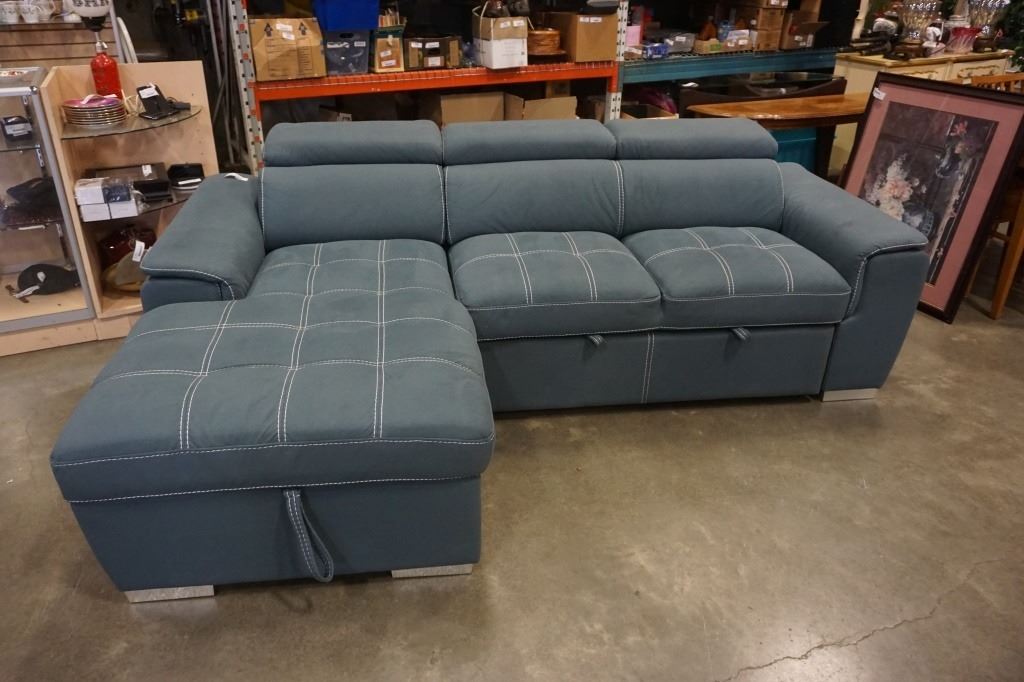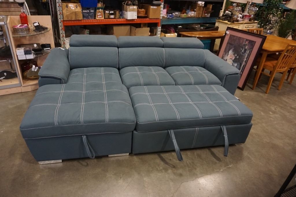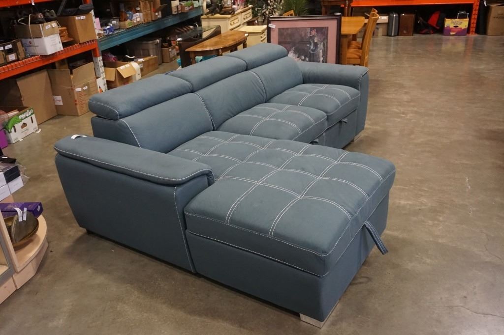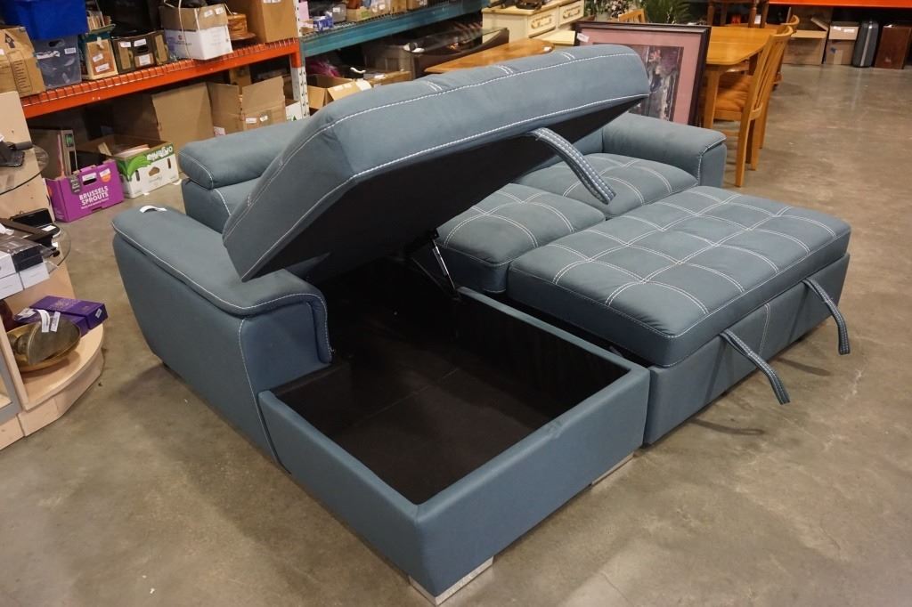 BLUE 2 PIECE SECTIONAL WITH WHITE STICHING, STORAGE CHAISE, ADJUSTABLE HEADRESTS AND PULLOUT SECTION